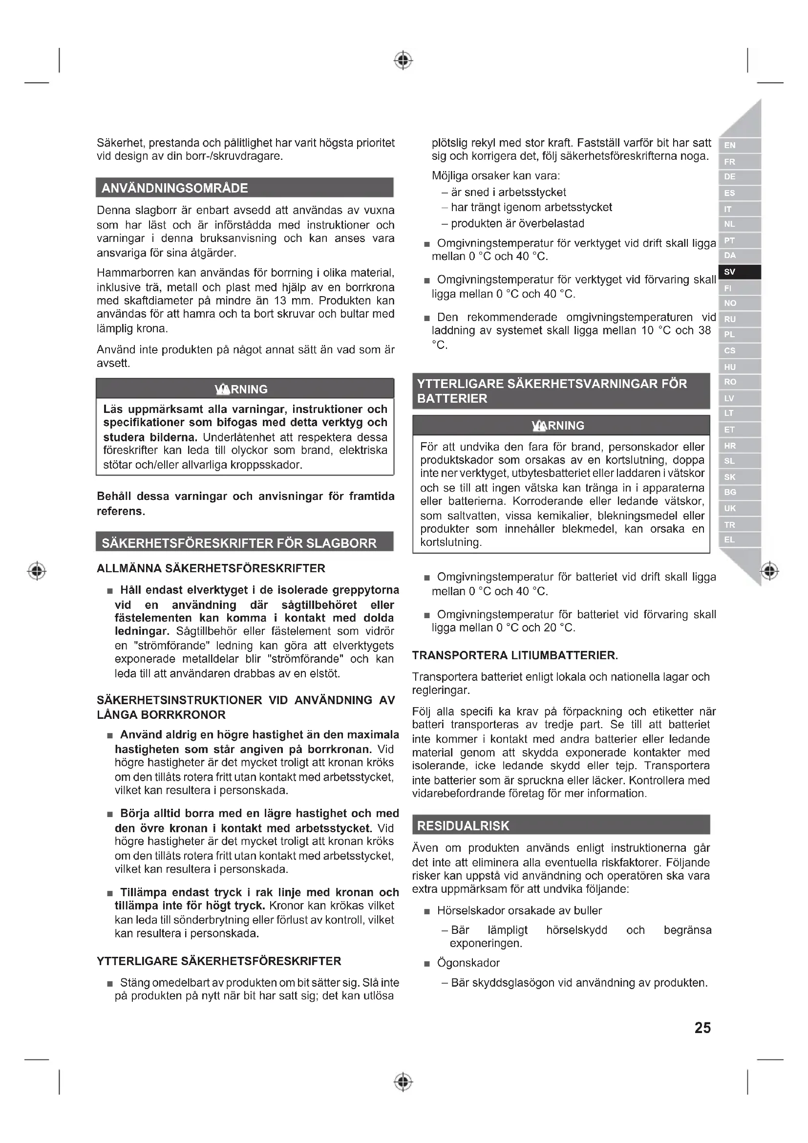 ■ Stäng omedelbart av produkten om bit sätter sig. Slå inte på produkten på nytt när bit har satt sig; det kan utlösa plötslig rekyl med stor kraft. Fastställ varför bit har satt sig och korrigera det, följ säkerhetsföreskrifterna noga. Möjliga orsaker kan vara: – är sned i arbetsstycket – har trängt igenom arbetsstycket – produkten är överbelastad ■ Omgivningstemperatur för verktyget vid drift skall ligga mellan 0 °C och 40 °C. ■ Omgivningstemperatur för verktyget vid förvaring skall ligga mellan 0 °C och 40 °C. ■ Den rekommenderade omgivningstemperaturen vid laddning av systemet skall ligga mellan 10 °C och 38 °C.