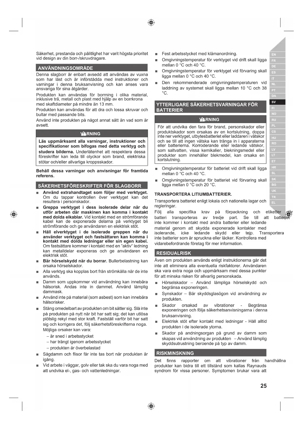 i kontakt med plastdelar. Dessa ämnen innehåller kemiska produkter som kan skada, försvaga eller förstöra plasten. Ŷ Använd alltid skyddsglasögon när du använder verktyget eller när du blåser damm. Använd en ansiktsmask om det dammar mycket. Ŷ För säkerhet och pålitlighet ska alla reparationer utföras av auktoriserat reparationscenter. SMÖRJNING Alla lager i produkten har smorts med tillräcklig mängd K|JNODVVLJ VP|UMPHGHO I|U SURGXNWHQV OLYVOlQJG XQGHU normala driftsförhållanden. Därför behövs ingen ytterligare VP|UMQLQJ MILJÖSKYDD Råmaterialen ska återvinnas i stället för att NDVWDVL KXVKnOOVDYIDOOHW)|U DWWVNRQD PLOM|Q ska verktyget, tillbehören och emballagen sorteras. E-TORQUE E-TORQUE CONTROL är en teknik som automatiskt VNUXYDULQGHÀHVWDVNUXYDULQLYnPHG\WDQ 1lUGHQEH¿QQHUVLJLDXWRPDWLVNWVNUXYGUDJDUOlJHVWDQQDU ERUUHQ QlU VNUXYHQ lU MlPV PHG \WDQ 2P VNUXYHQ VND VNUXYDVLGMXSDUHIRUWVlWWDWWWU\FNDSnDYWU\FNDUHQ%RUUHQ E|UMDUXWI|UD VPn URWDWLRQHUPHG PnWWOLJ KDVWLJKHW6OlSS DYWU\FNDUHQQlUGHW|QVNDGHGMXSHWKDUQnWWV Vid användning av E-TORQUE CONTROL är det viktigt att säkerställa att skruven är korrekt placerad och inte glider av skruvhuvudet. Om skruvbiten är felaktigt monterad kam borren stanna i förtid för att förhindra skada på skruvhuvudet eller biten. Om detta händer, rikta om biten med skruvhuvudet och tryck in avtryckaren igen. NOTERA: E-TORQUE CONTROL fungerar med de ÀHVWD PDWHULDO RFK WLOOlPSQLQJDU PHQ GHW NDQ KlQGD DWW det inte fungerar med vissa material eller skruvar, t.ex. maskinskruvar eller plastgängor. SYMBOLER Säkerhetsvarning 26 | SvenskaCE-överensstämmelse V Volt Likström min