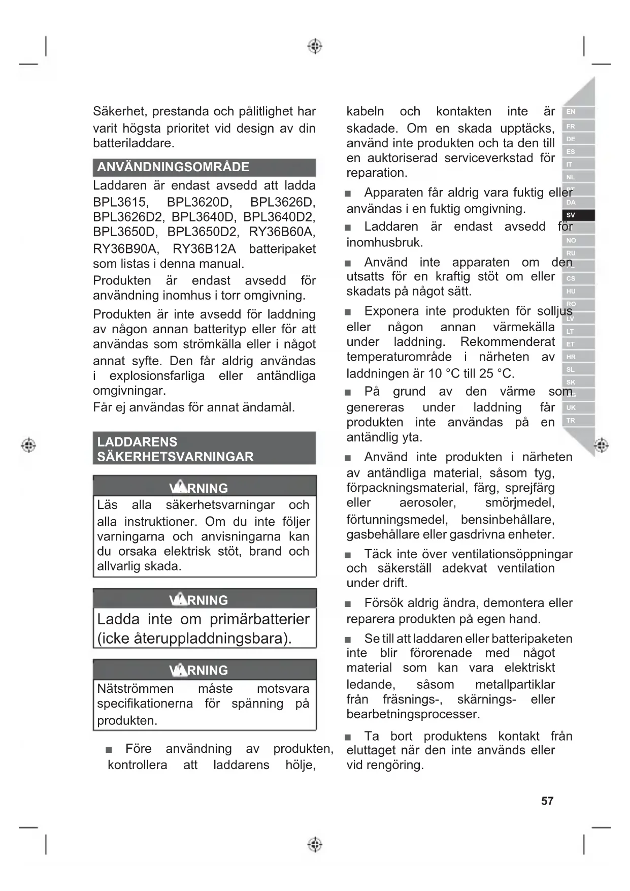 Laddaren är endast avsedd att ladda BPL3615, BPL3620D, BPL3626D, BPL3626D2, BPL3640D, BPL3640D2, BPL3650D, BPL3650D2, RY36B60A, RY36B90A, RY36B12A batteripaket som listas i denna manual. Produkten är endast avsedd för användning inomhus i torr omgivning. Produkten är inte avsedd för laddning av någon annan batterityp eller för att användas som strömkälla eller i något annat syfte. Den får aldrig användas i explosionsfarliga eller antändliga omgivningar. Får ej användas för annat ändamål. LADDARENS SÄKERHETSVARNINGAR VARNING Läs alla säkerhetsvarningar och alla instruktioner. Om du inte följer varningarna och anvisningarna kan du orsaka elektrisk stöt, brand och allvarlig skada. VARNING Ladda inte om primärbatterier (icke återuppladdningsbara). VARNING Nätströmmen måste motsvara specifikationerna för spänning på produkten. ■ Före användning av produkten, kontrollera att laddarens hölje, kabeln och kontakten inte är skadade. Om en skada upptäcks, använd inte produkten och ta den till en auktoriserad serviceverkstad för reparation. ■ Apparaten får aldrig vara fuktig eller användas i en fuktig omgivning. ■ Laddaren är endast avsedd för inomhusbruk. ■ Använd inte apparaten om den utsatts för en kraftig stöt om eller skadats på något sätt. ■ Exponera inte produkten för solljus eller någon annan värmekälla under laddning. Rekommenderat temperaturområde i närheten av laddningen är 10 °C till 25 °C. ■ På grund av den värme som genereras under laddning får produkten inte användas på en antändlig yta. ■ Använd inte produkten i närheten av antändliga material, såsom tyg, förpackningsmaterial, färg, sprejfärg eller aerosoler, smörjmedel, förtunningsmedel, bensinbehållare, gasbehållare eller gasdrivna enheter. ■ Täck inte över ventilationsöppningar och säkerställ adekvat ventilation under drift. ■ Försök aldrig ändra, demontera eller reparera produkten på egen hand. ■ Se till att laddaren eller batteripaketen inte blir förorenade med något material som kan vara elektriskt ledande, såsom metallpartiklar från fräsnings-, skärnings- eller bearbetningsprocesser. ■ Ta bort produktens kontakt från eluttaget när den inte används eller vid rengöring.58 | Svenska ■ Använd endast en förlängningskabel som är godkänd och i gott skick. ■ Ladda inte batteripaket som visar tecken på läckage. Kassera dem på korrekt sätt. ■ Ladda aldrig ett skadat batteripaket. Byt omedelbart ut skadade batteripaket. ■ Kontrollera alltid elkabeln före användning. Om det finns tecken på skada ska den bytas ut av utbildad tekniker på godkänt servicecenter för att undvika skaderisk. YTTERLIGARE