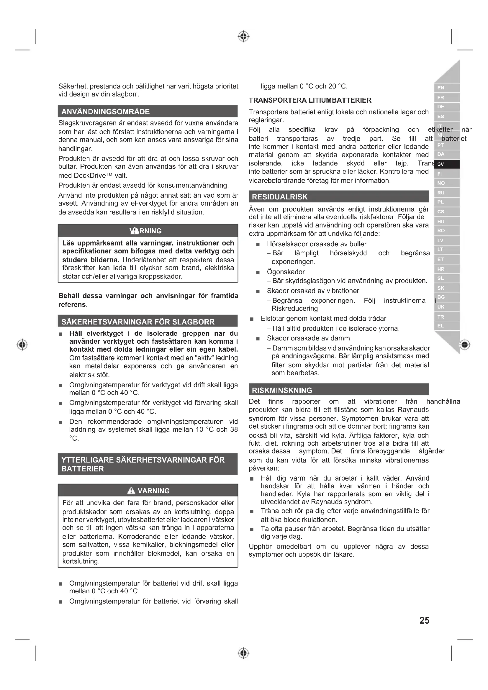 BATTERIER VARNING För att undvika den fara för brand, personskador eller produktskador som orsakas av en kortslutning, doppa inte ner verktyget, utbytesbatteriet eller laddaren i vätskor och se till att ingen vätska kan tränga in i apparaterna eller batterierna. Korroderande eller ledande vätskor, som saltvatten, vissa kemikalier, blekningsmedel eller produkter som innehåller blekmedel, kan orsaka en kortslutning. Ŷ Omgivningstemperatur för batteriet vid drift skall ligga mellan 0 °C och 40 °C. Ŷ Omgivningstemperatur för batteriet vid förvaring skall ligga mellan 0 °C och 20 °C. TRANSPORTERA LITIUMBATTERIER Transportera batteriet enligt lokala och nationella lagar och regleringar. )|OM DOOD VSHFL¿ND NUDY Sn I|USDFNQLQJ RFK HWLNHWWHU QlU EDWWHUL WUDQVSRUWHUDV DY WUHGMH SDUW 6H WLOO DWW EDWWHULHW inte kommer i kontakt med andra batterier eller ledande material genom att skydda exponerade kontakter med LVROHUDQGH LFNH OHGDQGH VN\GG HOOHU WHMS 7UDQVSRUWHUD inte batterier som är spruckna eller läcker. Kontrollera med vidarebefordrande företag för mer information. RESIDUALRISK Även om produkten används enligt instruktionerna går GHWLQWHDWWHOLPLQHUDDOODHYHQWXHOODULVNIDNWRUHU)|OMDQGH risker kan uppstå vid användning och operatören ska vara H[WUDXSSPlUNVDPI|UDWWXQGYLNDI|OMDQGH Ŷ Hörselskador orsakade av buller – Bär lämpligt hörselskydd och begränsa exponeringen. Ŷ Ögonskador – Bär skyddsglasögon vid användning av produkten. Ŷ Skador orsakad av vibrationer – %HJUlQVD H[SRQHULQJHQ )|OM LQVWUXNWLQHUQD L Riskreducering. Ŷ Elstötar genom kontakt med dolda trådar – Håll alltid produkten i de isolerade ytorna. Ŷ Skador orsakade av damm – Damm som bildas vid användning kan orsaka skador på andningsvägarna. Bär lämplig ansiktsmask med filter som skyddar mot partiklar från det material som bearbetas. RISKMINSKNING 'HW ¿QQV UDSSRUWHU RP DWW YLEUDWLRQHU IUnQ KDQGKnOOQD produkter kan bidra till ett tillstånd som kallas Raynauds syndrom för vissa personer. Symptomen brukar vara att