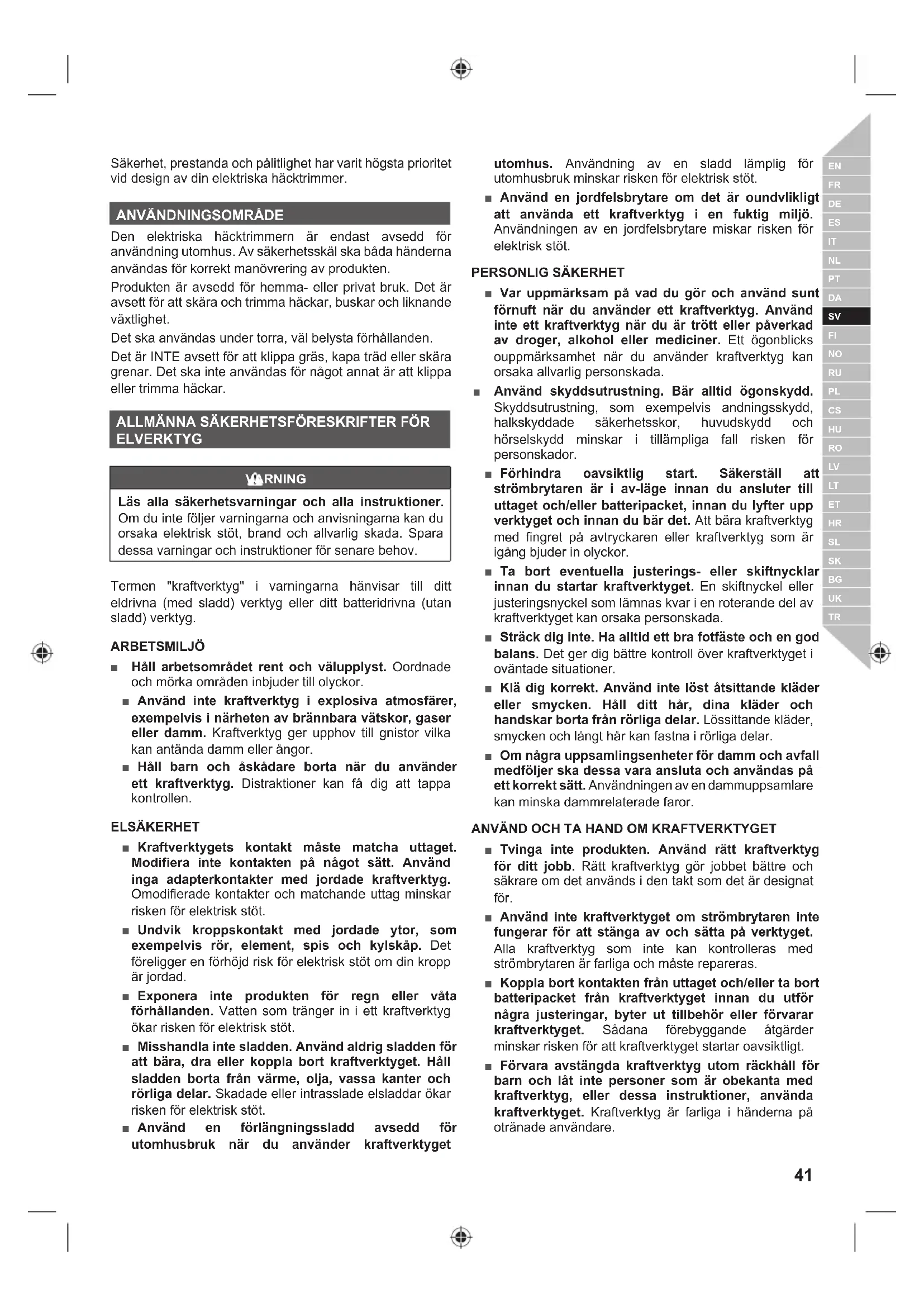 Den elektriska häcktrimmern är endast avsedd för användning utomhus. Av säkerhetsskäl ska båda händerna användas för korrekt manövrering av produkten. Produkten är avsedd för hemma- eller privat bruk. Det är avsett för att skära och trimma häckar, buskar och liknande växtlighet. Det ska användas under torra, väl belysta förhållanden. Det är INTE avsett för att klippa gräs, kapa träd eller skära grenar. Det ska inte användas för något annat är att klippa eller trimma häckar. ALLMÄNNA SÄKERHETSFÖRESKRIFTER FÖR ELVERKTYG VARNING Läs alla säkerhetsvarningar och alla instruktioner. Om du inte följer varningarna och anvisningarna kan du orsaka elektrisk stöt, brand och allvarlig skada. Spara dessa varningar och instruktioner för senare behov. Termen "kraftverktyg" i varningarna hänvisar till ditt eldrivna (med sladd) verktyg eller ditt batteridrivna (utan sladd) verktyg. ARBETSMILJÖ ■ Håll arbetsområdet rent och välupplyst. Oordnade och mörka områden inbjuder till olyckor. ■ Använd inte kraftverktyg i explosiva atmosfärer, exempelvis i närheten av brännbara vätskor, gaser eller damm. Kraftverktyg ger upphov till gnistor vilka kan antända damm eller ångor. ■ Håll barn och åskådare borta när du använder ett kraftverktyg. Distraktioner kan få dig att tappa kontrollen. ELSÄKERHET ■ Kraftverktygets kontakt måste matcha uttaget. Modifiera inte kontakten på något sätt. Använd inga adapterkontakter med jordade kraftverktyg. Omodifierade kontakter och matchande uttag minskar risken för elektrisk stöt. ■ Undvik kroppskontakt med jordade ytor, som exempelvis rör, element, spis och kylskåp. Det föreligger en förhöjd risk för elektrisk stöt om din kropp är jordad. ■ Exponera inte produkten för regn eller våta förhållanden. Vatten som tränger in i ett kraftverktyg ökar risken för elektrisk stöt. ■ Misshandla inte sladden. Använd aldrig sladden för att bära, dra eller koppla bort kraftverktyget. Håll sladden borta från värme, olja, vassa kanter och rörliga delar. Skadade eller intrasslade elsladdar ökar risken för elektrisk stöt. ■ Använd en förlängningssladd avsedd för utomhusbruk när du använder kraftverktyget utomhus. Användning av en sladd lämplig för utomhusbruk minskar risken för elektrisk stöt. ■ Använd en jordfelsbrytare om det är oundvlikligt att använda ett kraftverktyg i en fuktig miljö. Användningen av en jordfelsbrytare miskar risken för elektrisk stöt.