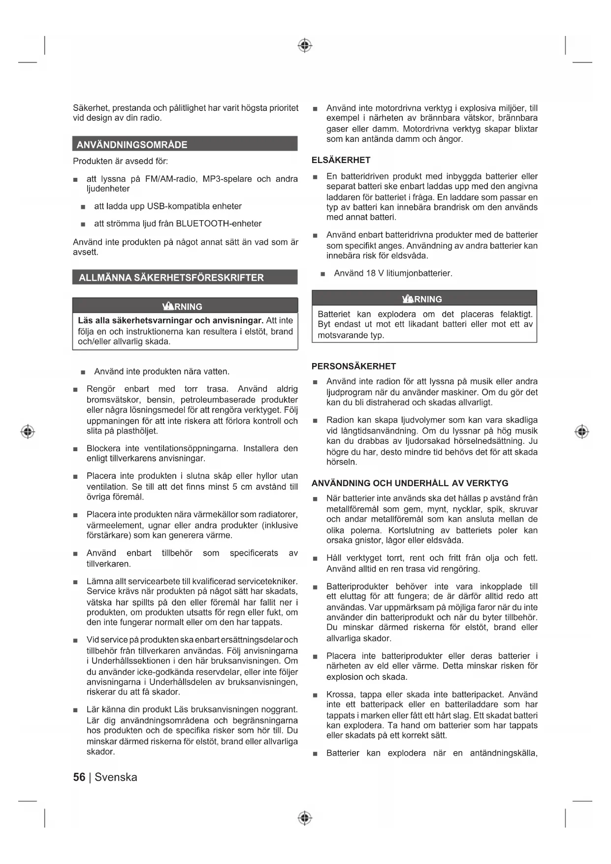 VARNING Läs alla säkerhetsvarningar och anvisningar. Att inte följa en och instruktionerna kan resultera i elstöt, brand och/eller allvarlig skada. ■ Använd inte produkten nära vatten. ■ Rengör enbart med torr trasa. Använd aldrig bromsvätskor, bensin, petroleumbaserade produkter eller några lösningsmedel för att rengöra verktyget. Följ uppmaningen för att inte riskera att förlora kontroll och slita på plasthöljet. ■ Blockera inte ventilationsöppningarna. Installera den enligt tillverkarens anvisningar. ■ Placera inte produkten i slutna skåp eller hyllor utan ventilation. Se till att det finns minst 5 cm avstånd till övriga föremål. ■ Placera inte produkten nära värmekällor som radiatorer, värmeelement, ugnar eller andra produkter (inklusive förstärkare) som kan generera värme. ■ Använd enbart tillbehör som specificerats av tillverkaren. ■ Lämna allt servicearbete till kvalificerad servicetekniker. Service krävs när produkten på något sätt har skadats, vätska har spillts på den eller föremål har fallit ner i produkten, om produkten utsatts för regn eller fukt, om den inte fungerar normalt eller om den har tappats. ■ Vid service på produkten ska enbart ersättningsdelar och tillbehör från tillverkaren användas. Följ anvisningarna i Underhållssektionen i den här bruksanvisningen. Om du använder icke-godkända reservdelar, eller inte följer anvisningarna i Underhållsdelen av bruksanvisningen, riskerar du att få skador. ■ Lär känna din produkt Läs bruksanvisningen noggrant. Lär dig användningsområdena och begränsningarna hos produkten och de specifika risker som hör till. Du minskar därmed riskerna för elstöt, brand eller allvarliga skador. ■ Använd inte motordrivna verktyg i explosiva miljöer, till exempel i närheten av brännbara vätskor, brännbara gaser eller damm. Motordrivna verktyg skapar blixtar som kan antända damm och ångor. ELSÄKERHET ■ En batteridriven produkt med inbyggda batterier eller separat batteri ske enbart laddas upp med den angivna laddaren för batteriet i fråga. En laddare som passar en typ av batteri kan innebära brandrisk om den används med annat batteri. ■ Använd enbart batteridrivna produkter med de batterier som specifikt anges. Användning av andra batterier kan innebära risk för eldsvåda. ■ Använd 18 V litiumjonbatterier. VARNING Batteriet kan explodera om det placeras felaktigt. Byt endast ut mot ett likadant batteri eller mot ett av motsvarande typ. PERSONSÄKERHET ■ Använd inte radion för att lyssna på musik eller andra ljudprogram när du använder maskiner. Om du gör det kan du bli distraherad och skadas allvarligt. ■ Radion kan skapa ljudvolymer som kan vara skadliga vid långtidsanvändning. Om du lyssnar på hög musik kan du drabbas av ljudorsakad hörselnedsättning. Ju högre du har, desto mindre tid behövs det för att skada hörseln.