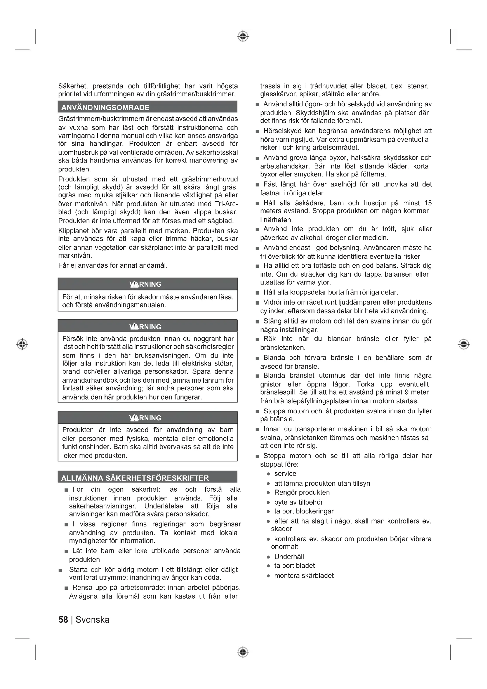 ■ För din egen säkerhet: läs och förstå alla instruktioner innan produkten används. Följ alla säkerhetsanvisningar. Underlåtelse att följa alla anvisningar kan medföra svåra personskador. ■ I vissa regioner finns regleringar som begränsar användning av produkten. Ta kontakt med lokala myndigheter för information. ■ Låt inte barn eller icke utbildade personer använda produkten. ■ Starta och kör aldrig motorn i ett tillstängt eller dåligt ventilerat utrymme; inandning av ångor kan döda. ■ Rensa upp på arbetsområdet innan arbetet påbörjas. Avlägsna alla föremål som kan kastas ut från eller trassla in sig i trådhuvudet eller bladet, t.ex. stenar, glasskärvor, spikar, ståltråd eller snöre. ■ Använd alltid ögon- och hörselskydd vid användning av produkten. Skyddshjälm ska användas på platser där det finns risk för fallande föremål. ■ Hörselskydd kan begränsa användarens möjlighet att höra varningsljud. Var extra uppmärksam på eventuella risker i och kring arbetsområdet. ■ Använd grova långa byxor, halksäkra skyddsskor och arbetshandskar. Bär inte löst sittande kläder, korta byxor eller smycken. Ha skor på fötterna. ■ Fäst långt hår över axelhöjd för att undvika att det fastnar i rörliga delar. ■ Håll alla åskådare, barn och husdjur på minst 15 meters avstånd. Stoppa produkten om någon kommer i närheten. ■ Använd inte produkten om du är trött, sjuk eller påverkad av alkohol, droger eller medicin. ■ Använd endast i god belysning. Användaren måste ha fri överblick för att kunna identifiera eventuella risker. ■ Ha alltid ett bra fotfäste och en god balans. Sträck dig inte. Om du sträcker dig kan du tappa balansen eller utsättas för varma ytor. ■ Håll alla kroppsdelar borta från rörliga delar. ■ Vidrör inte området runt ljuddämparen eller produktens cylinder, eftersom dessa delar blir heta vid användning. ■ Stäng alltid av motorn och låt den svalna innan du gör några inställningar. ■ Rök inte när du blandar bränsle eller fyller på bränsletanken. ■ Blanda och förvara bränsle i en behållare som är avsedd för bränsle. ■ Blanda bränslet utomhus där det inte finns några gnistor eller öppna lågor. Torka upp eventuellt bränslespill. Se till att ha ett avstånd på minst 9 meter från bränslepåfyllningsplatsen innan motorn startas. ■ Stoppa motorn och låt produkten svalna innan du fyller på bränsle. ■ Innan du transporterar maskinen i bil så ska motorn svalna, bränsletanken tömmas och maskinen fästas så att den inte rör sig. ■ Stoppa motorn och se till att alla rörliga delar har stoppat före: ● service ● att lämna produkten utan tillsyn ● Rengör produkten ● byte av tillbehör ● ta bort blockeringar ● efter att ha slagit i något skall man kontrollera ev. skador ● kontrollera ev. skador om produkten börjar vibrera onormalt ● Underhåll ● ta bort bladet ● montera skärbladet59Svenska |