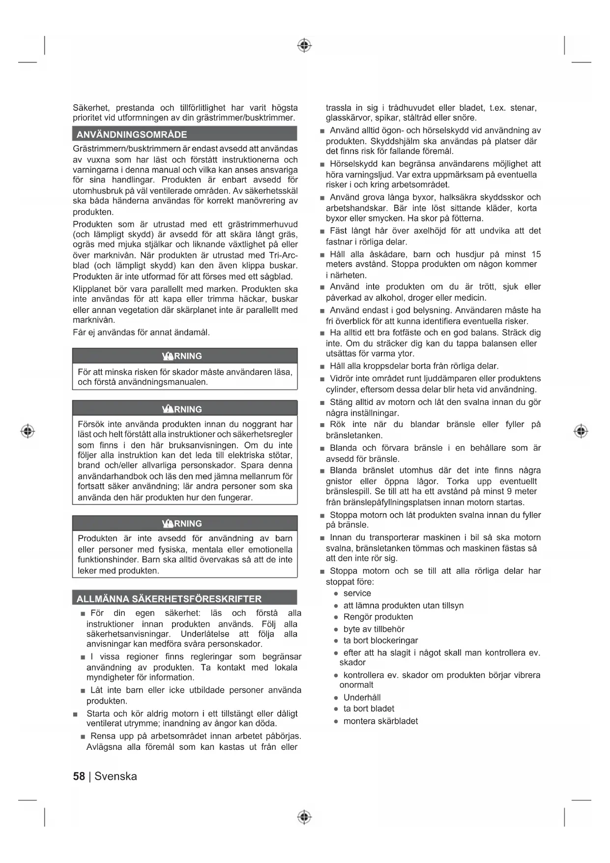 Bemærk Advarsel58 | Svenska Säkerhet, prestanda och tillförlitlighet har varit högsta prioritet vid utformningen av din grästrimmer/busktrimmer.