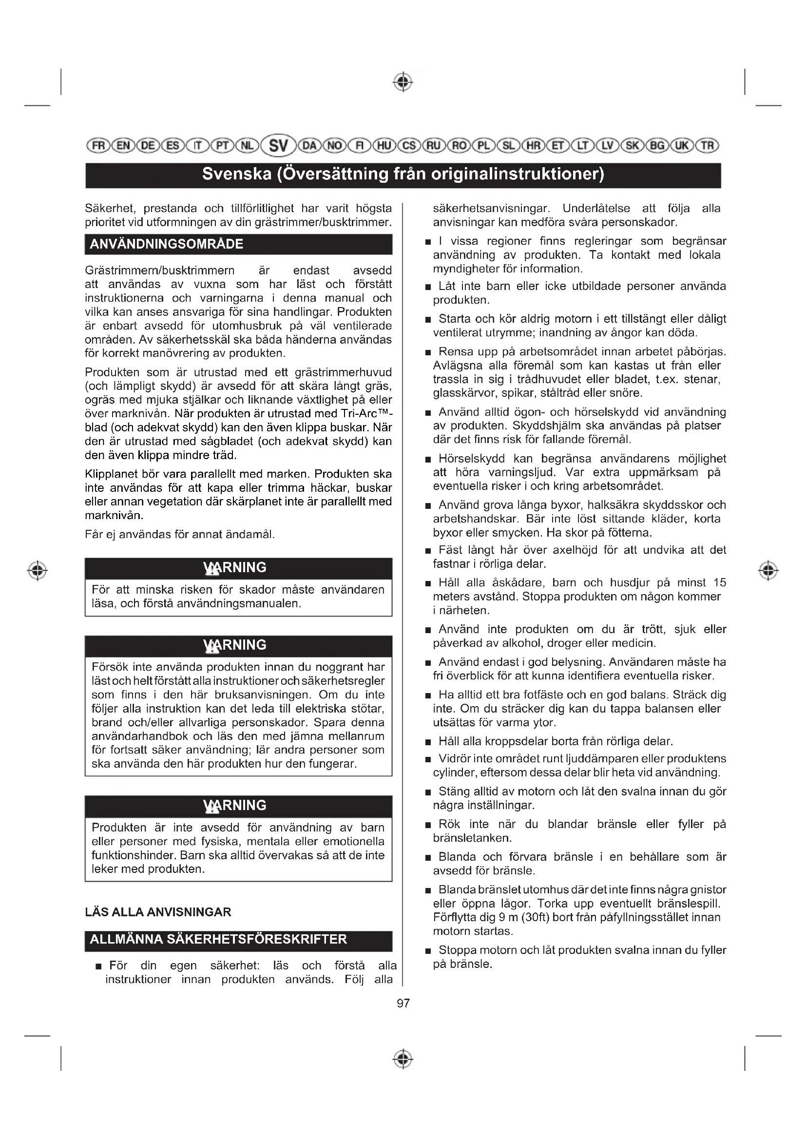 Grästrimmern/busktrimmern är endast avsedd att användas av vuxna som har läst och förstått instruktionerna och varningarna i denna manual och vilka kan anses ansvariga för sina handlingar. Produkten är enbart avsedd för utomhusbruk på väl ventilerade områden. Av säkerhetsskäl ska båda händerna användas för korrekt manövrering av produkten. Produkten som är utrustad med ett grästrimmerhuvud (och lämpligt skydd) är avsedd för att skära långt gräs, ogräs med mjuka stjälkar och liknande växtlighet på eller över marknivån. När produkten är utrustad med Tri-Arc™- blad (och adekvat skydd) kan den även klippa buskar. När den är utrustad med sågbladet (och adekvat skydd) kan den även klippa mindre träd. Klipplanet bör vara parallellt med marken. Produkten ska inte användas för att kapa eller trimma häckar, buskar eller annan vegetation där skärplanet inte är parallellt med marknivån. Får ej användas för annat ändamål. VARNING För att minska risken för skador måste användaren läsa, och förstå användningsmanualen. VARNING Försök inte använda produkten innan du noggrant har läst och helt förstått alla instruktioner och säkerhetsregler som finns i den här bruksanvisningen. Om du inte följer alla instruktion kan det leda till elektriska stötar, brand och/eller allvarliga personskador. Spara denna användarhandbok och läs den med jämna mellanrum för fortsatt säker användning; lär andra personer som ska använda den här produkten hur den fungerar. VARNING Produkten är inte avsedd för användning av barn eller personer med fysiska, mentala eller emotionella funktionshinder. Barn ska alltid övervakas så att de inte leker med produkten.