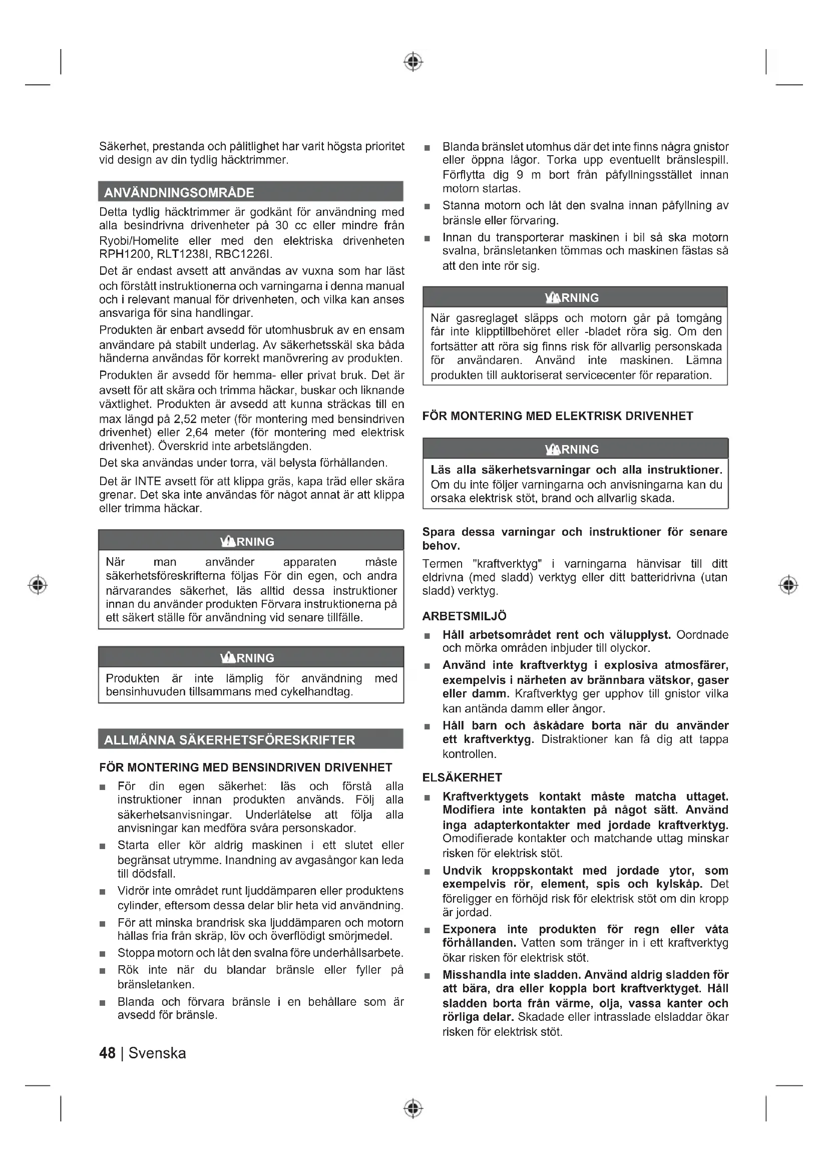 Detta tydlig häcktrimmer är godkänt för användning med alla besindrivna drivenheter på 30 cc eller mindre från Ryobi/Homelite eller med den elektriska drivenheten RPH1200, RLT1238I, RBC1226I. Det är endast avsett att användas av vuxna som har läst och förstått instruktionerna och varningarna i denna manual och i relevant manual för drivenheten, och vilka kan anses ansvariga för sina handlingar. Produkten är enbart avsedd för utomhusbruk av en ensam användare på stabilt underlag. Av säkerhetsskäl ska båda händerna användas för korrekt manövrering av produkten. Produkten är avsedd för hemma- eller privat bruk. Det är avsett för att skära och trimma häckar, buskar och liknande växtlighet. Produkten är avsedd att kunna sträckas till en max längd på 2,52 meter (för montering med bensindriven drivenhet) eller 2,64 meter (för montering med elektrisk drivenhet). Överskrid inte arbetslängden. Det ska användas under torra, väl belysta förhållanden. Det är INTE avsett för att klippa gräs, kapa träd eller skära grenar. Det ska inte användas för något annat är att klippa eller trimma häckar. VARNING När man använder apparaten måste säkerhetsföreskrifterna följas För din egen, och andra närvarandes säkerhet, läs alltid dessa instruktioner innan du använder produkten Förvara instruktionerna på ett säkert ställe för användning vid senare tillfälle. VARNING Produkten är inte lämplig för användning med bensinhuvuden tillsammans med cykelhandtag.
