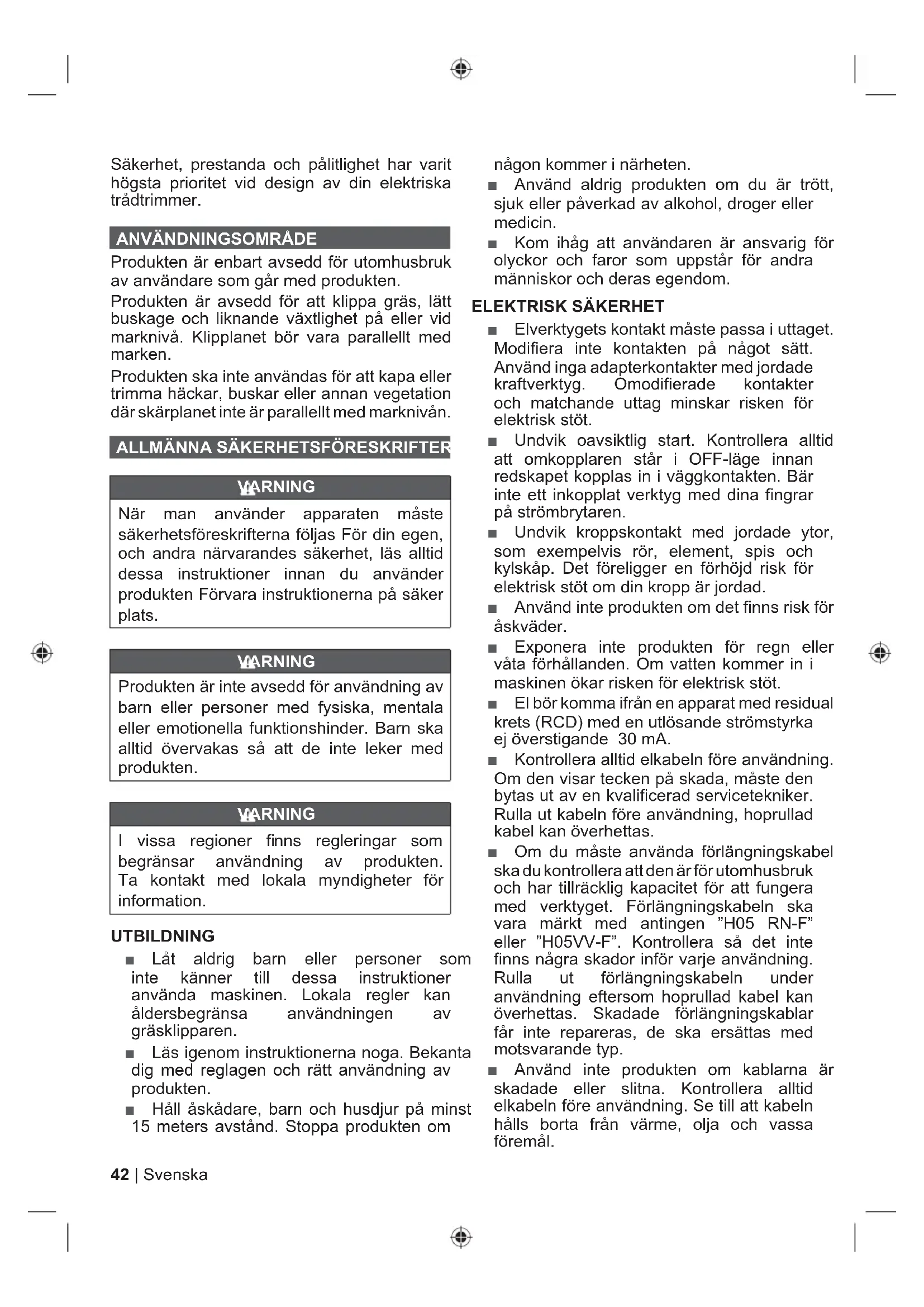 Produkten är enbart avsedd för utomhusbruk av användare som går med produkten. Produkten är avsedd för att klippa gräs, lätt buskage och liknande växtlighet på eller vid marknivå. Klipplanet bör vara parallellt med marken. Produkten ska inte användas för att kapa eller trimma häckar, buskar eller annan vegetation där skärplanet inte är parallellt med marknivån.