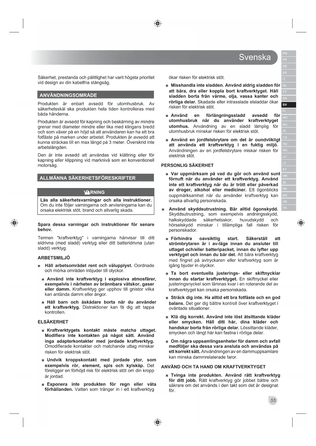 ■ I vissa regioner finns regleringar som begränsar användning av produkten. Ta kontakt med lokala myndigheter för information. ■ Låt aldrig barn eller personer som inte har läst dessa anvisningar använda produkten. Lokala regler kan åldersbegränsa användningen av gräsklipparen. ■ Kontrollera före användning så att reglage och säkerhetsanordningar fungerar som de ska. Använd inte produkten om "Off"-läget inte stoppar motorn. ■ Använd heltäckande skyddsglasögon och hörselskydd, ordentligt grova handskar och skyddshjälm vid användning av produkten. Använd ansiktsmask om det dammar mycket. ■ Bär inte löst sittande kläder, korta byxor eller smycken av något slag. ■ Sätt upp hår som är längre än till axlarna så att det inte trasslas in i rörliga delar. ■ Se upp för kringflygande föremål; håll alla åskådare, barn och husdjur på minst 15 meters avstånd. ■ Använd endast i god belysning. Operatören måste ha god överblick över arbetsområdet för att upptäcka potentiella faror. ■ När du använder hörselskydd minskar din förmåga att uppfatta varningar (skrik och alarm). Du måste vara extra uppmärksam på vad som sker i arbetsområdet. ■ Användning av liknande maskiner i närheten ökar risken för både hörselskador och för andra personer i närheten av arbetsområdet. ■ Bibehåll ett bra fotfäste och bra balans. Sträck dig inte. Sträck dig inte för långt så att du tappar balansen och ökar risken för bakslag. ■ Håll alla kroppsdelar borta från rörliga delar. ■ Se över maskinen inför varje användning. Se till att alla reglage fungerar som de ska. Kontrollera för lösa fästen, se till att alla skydd och handtag sitter ordentligt på plats. Byt ut eventuella skadade delar före användning. ■ Modifiera inte maskinen på något sätt och använd inte delar eller tillbehör som inte rekommenderats av tillverkaren. ■ Låt inte rutin med produkten göra dig ovarsam. Glöm inte att om du är ouppmärksam bara bråkdelen av en sekund kan du skada dig allvarligt. ■ Håll handtag och grepp torra, rena och fria från olja och smörjfett. Hala handtag och grepp innebär osäker hantering och dålig kontroll över verktyget i oväntade situationer. ■ Använd enbart vädersäkrad förlängningskabel. Kontrollera förlängningskabeln så det inte finns några skador inför varje användning. Rulla ut förlängningskabeln under användning eftersom hoprullad kabel kan överhettas. Skadade förlängningskablar får inte repareras, de ska ersättas med motsvarande typ. VARNING Om produkten tappas, utsätts för hårda slag eller börjar vibrera onormalt mycket ska produkten omedelbart stoppas och kontrolleras för eventuella skador eller orsak till vibrationerna. Eventuella skador ska repareras ordentligt eller bytas ut av ett auktoriserat servicecenter. SÄKERHETSFÖRESKRIFTER FÖR BESKÄRARE ■ Använd inte produkten om det finns risk för åskväder och blixtnedslag. Förvara produkten i säkerhet inomhus. ■ Se till att alla skydd, handtag och spikskydd sitter ordentligt och är i gott skick. ■ Börja inte använda produkten innan arbetsområdet är rensat, du har säkert fotfäste och en planerad reträttväg bort från fallande träd eller grenar.Svenska