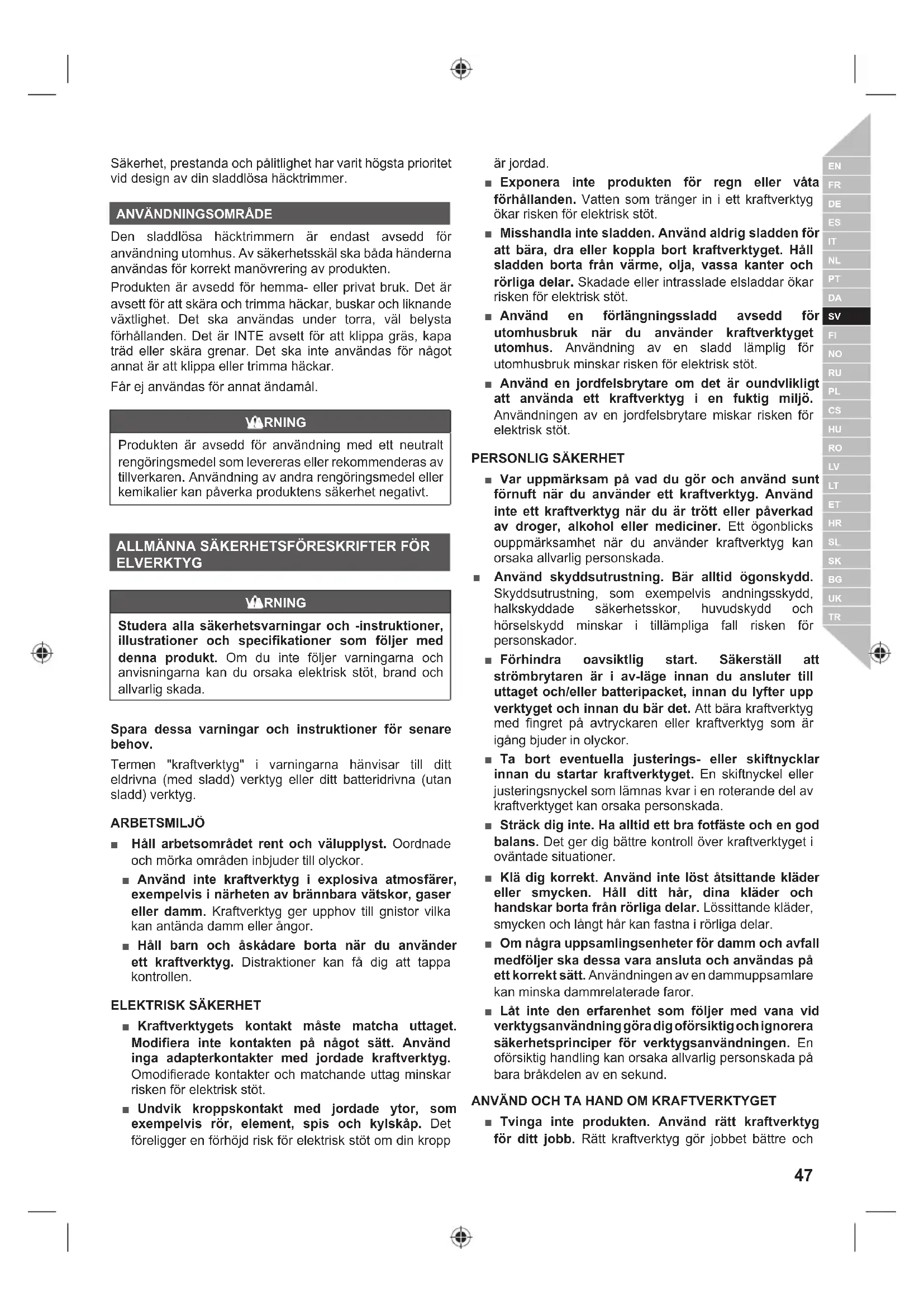 Säkerhet, prestanda och pålitlighet har varit högsta prioritet vid design av din sladdlösa häcktrimmer.