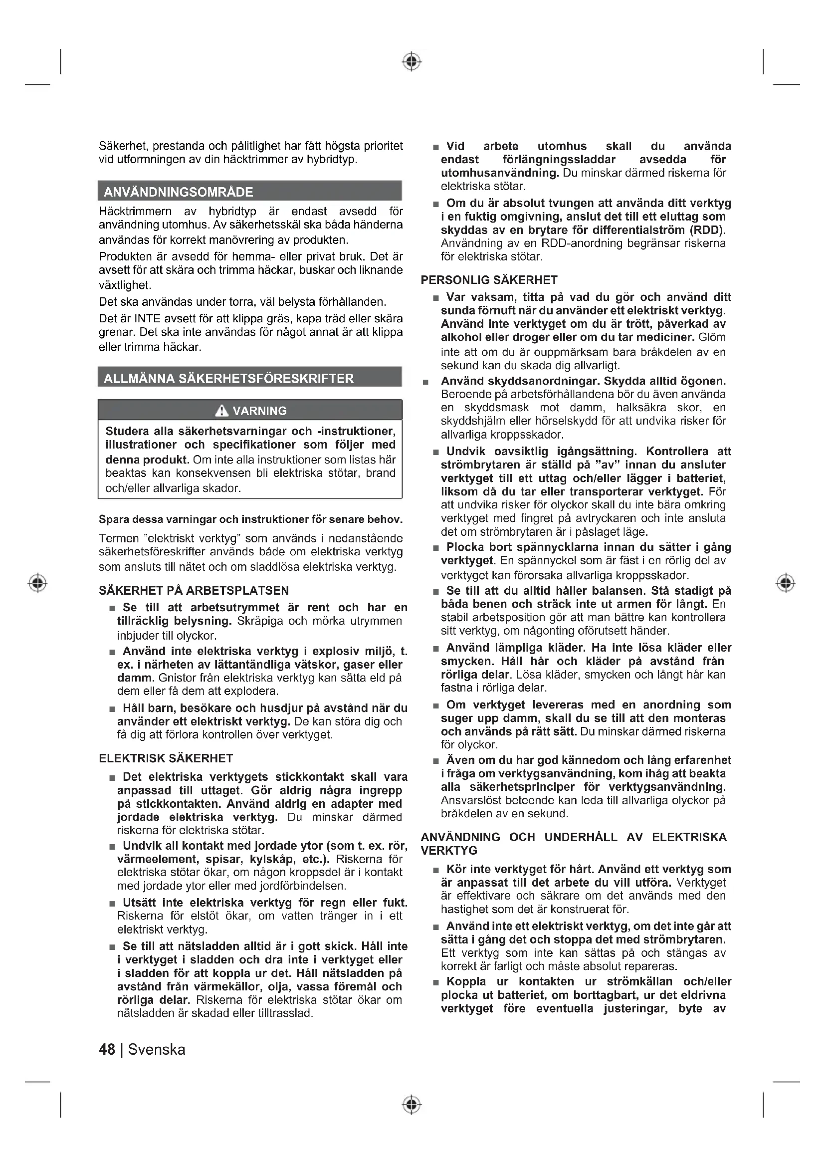 ■ En del regioner har regelverk som begränsar produktens användning till vissa funktioner. Ta kontakt med lokala myndigheter för information. Läs alla anvisningar ■ Rensa upp på arbetsområdet innan arbetet påbörjas. Ta bort alla föremål som kablar, lampor, rep eller trådar som kan trasslas in i skärklingan.50 | Svenska ■ Kontroller häcken avseende främmande föremål som t.ex. trådstaket etc. ■ Var extra försiktig vid användning av produkten nära staket, stolpar, byggnader eller andra fasta föremål. ■ Se upp för kringflygande föremål; håll alla åskådare, barn och husdjur på minst 15 meters avstånd. ■ Låt inte barn eller icke utbildade personer använda produkten. ■ Använd endast i god belysning. Operatören måste ha god överblick över arbetsområdet för att upptäcka potentiella faror. ■ Se alltid till att alla handtag och skydd sitter på när maskinen används. Försök aldrig att använda en ofullständig produkt eller en produkt som modifierats på ej auktoriserat sätt. ■ Kontrollera före användning så att reglage och säkerhetsanordningar fungerar som de ska. Använd inte produkten om "Off"-läget inte stoppar motorn. ■ Se över maskinen inför varje användning. Kontrollera lösa fästen. Se till att alla skydd och handtag sitter fast ordentligt Byt ut eventuella skadade delar före användning. Kontrollera läckor från batteriet. ■ Ändra inte produkten på något sätt. ■ Använd alltid ögon- och hörselskydd vid användning av produkten. Skyddshjälm ska användas på platser där det finns risk för fallande föremål. ■ Bär grova, långa byxor, stövlar och handskar. Bär inte löst sittande kläder, korta byxor eller smycken. Ha skor på fötterna. ■ Sätt upp hår som är längre än till axlarna så att det inte trasslas in i rörliga delar. ■ När du använder hörselskydd minskar din förmåga att uppfatta varningar (skrik och alarm). Du måste vara extra uppmärksam på vad som sker i arbetsområdet. ■ Användning av liknande maskiner i närheten ökar risken för både hörselskador och för andra personer i närheten av arbetsområdet. ■ Använd inte produkten om du är trött, sjuk eller påverkad av alkohol, droger eller medicin. ■ Bibehåll ett bra fotfäste och bra balans. Sträck dig inte. Sträcker du dig för långt finns risk att du tappar balansen och orsakar allvarlig personskada. ■ Håll alla kroppsdelar borta från rörliga delar. ■ Innan maskinen startas ska du se till att skärklingan inte är i kontakt med något. ■ Vid användning av stavhäcksaxen ska den hållas fast med båda händerna på handtagen och arbetsläget ska vara säkert och tryggt. Tillverkaren rekommenderar inte användning av stegar eller trappor. Om det ska klippas på högre höjd ska förlängningstillbehör användas. ■ Bladen är vassa. Vid hantering av klingan ska du använda halkfria, grova skyddshandskar. Placera inte händer eller fingrar mellan bladen eller på något ställe där de kan klämmas eller skäras. Vidrör aldrig bladet eller utför underhåll på produkterna om inte batteripaketet har tagits bort eller produkten kopplats bort från en strömkälla. ■ Slå från och ta bort batteripaketet eller koppla bort produkten från strömförsörjningen. Se till att samtliga rörliga delar har stannat helt: ● innan produkten lämnas utan uppsikt ● före rengöring eller rensning av ett stopp ● innan du ändrar arbetsläge för skärmekanismen ● före kontroll av, rengöring av eller arbete med produkten ■ Tvinga inte in häcktrimmern igenom grova buskar. Detta kan orsaka att knivbladen fastnar och saktar ned. Om knivarna saktar ned, reducera hastigheten ■ Försök inte klippa stammar eller grenar som är tjockare än 22 mm, eller de som uppenbarligen är för grova för att få in i skärbladet. Använd en ej motordriven handsåg för att kapa grova stammar. ■ Använd inte maskinen med en skadad eller utsliten skärdel. VARNING Om produkten tappas, utsätts för hårda slag eller börjar vibrera onormalt mycket ska produkten omedelbart stoppas och kontrolleras för eventuella skador eller orsak till vibrationerna. Eventuella skador ska repareras ordentligt eller bytas ut av ett auktoriserat servicecenter.
