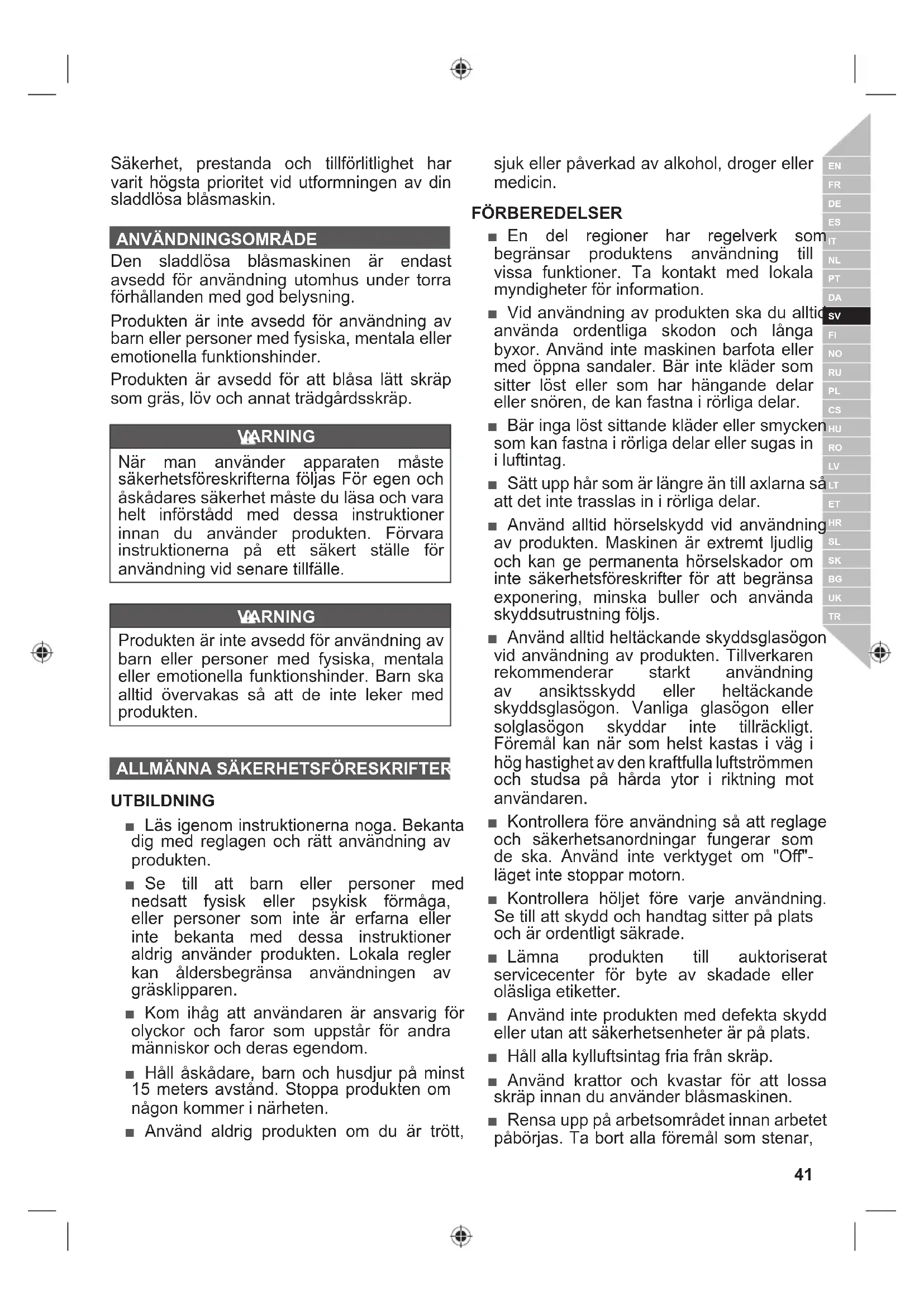 UTBILDNING ■ Läs igenom instruktionerna noga. Bekanta dig med reglagen och rätt användning av produkten. ■ Se till att barn eller personer med nedsatt fysisk eller psykisk förmåga, eller personer som inte är erfarna eller inte bekanta med dessa instruktioner aldrig använder produkten. Lokala regler kan åldersbegränsa användningen av gräsklipparen. ■ Kom ihåg att användaren är ansvarig för olyckor och faror som uppstår för andra människor och deras egendom. ■ Håll åskådare, barn och husdjur på minst 15 meters avstånd. Stoppa produkten om någon kommer i närheten. ■ Använd aldrig produkten om du är trött, sjuk eller påverkad av alkohol, droger eller medicin. FÖRBEREDELSER ■ En del regioner har regelverk som begränsar produktens användning till vissa funktioner. Ta kontakt med lokala myndigheter för information. ■ Vid användning av produkten ska du alltid använda ordentliga skodon och långa byxor. Använd inte maskinen barfota eller med öppna sandaler. Bär inte kläder som sitter löst eller som har hängande delar eller snören, de kan fastna i rörliga delar. ■ Bär inga löst sittande kläder eller smycken som kan fastna i rörliga delar eller sugas in i luftintag. ■ Sätt upp hår som är längre än till axlarna så att det inte trasslas in i rörliga delar. ■ Använd alltid hörselskydd vid användning av produkten. Maskinen är extremt ljudlig och kan ge permanenta hörselskador om inte säkerhetsföreskrifter för att begränsa exponering, minska buller och använda skyddsutrustning följs. ■ Använd alltid heltäckande skyddsglasögon vid användning av produkten. Tillverkaren rekommenderar starkt användning av ansiktsskydd eller heltäckande skyddsglasögon. Vanliga glasögon eller solglasögon skyddar inte tillräckligt. Föremål kan när som helst kastas i väg i hög hastighet av den kraftfulla luftströmmen och studsa på hårda ytor i riktning mot användaren. ■ Kontrollera före användning så att reglage och säkerhetsanordningar fungerar som de ska. Använd inte verktyget om "Off"- läget inte stoppar motorn. ■ Kontrollera höljet före varje användning. Se till att skydd och handtag sitter på plats och är ordentligt säkrade. ■ Lämna produkten till auktoriserat servicecenter för byte av skadade eller oläsliga etiketter. ■ Använd inte produkten med defekta skydd eller utan att säkerhetsenheter är på plats. ■ Håll alla kylluftsintag fria från skräp. ■ Använd krattor och kvastar för att lossa skräp innan du använder blåsmaskinen. ■ Rensa upp på arbetsområdet innan arbetet påbörjas. Ta bort alla föremål som stenar,42 | Svenska glasbitar, spikar, vajerbitar eller tråd som kan fara iväg långt med luften. ■ Använd bara produkten på en fast, plan yta. ANVÄNDNING OCH UNDERHÅLL AV BAT- TERIET ■ Använd endast den batteriladdare som tillverkaren rekommenderar. En batteriladdare som passar en typ av batteripack kan vara en brandfara om den används med en annan typ av batteripack. ■ Använd eldrivna verktyg med batteripaket som är speciellt utformade för användning tillsammans med produkterna. Om du använder andra batteripaket ökar du risken för skador och brand. ■ När batteripaketet inte används ska det hållas bort från metallföremål som gem, mynt, nycklar, spikar, skruvar och andra små metallföremål som kan kortsluta batteriets kontakter. Vid kortslutning av batteriets kontakter finns det risk för brännskador eller brand. ■ Vätska kan läcka ut från batteripacket vid felaktig användning; undvik kontakt med vätskan. Spola med vatten om du kommer i kontakt med den. Uppsök omedelbart läkarhjälp om du får vätska i ögonen. Den kan orsaka irritation och brännskador. ANVÄNDNING ■ Använd enbart maskinen under lämpliga tider – inte tidigt på morgonen eller sent på kvällen när det kan störa omgivningen. ■ Använd aldrig produkten i lättantändlig atmosfär. ■ Använd inte produkten i dåligt väder, speciellt inte om det finns risk för åskoväder. ■ Använd endast i god belysning. Operatören måste ha god överblick över arbetsområdet för att upptäcka potentiella faror. ■ När du använder hörselskydd minskar din förmåga att uppfatta varningar (skrik och alarm). Du måste vara extra uppmärksam på vad som sker i arbetsområdet. ■ Låt dig inte distraheras och fokusera alltid på arbetsuppgiften. ■ Användning av liknande maskiner i närheten ökar risken för både hörselskador och för andra personer i närheten av arbetsområdet. ■ Bibehåll ett bra fotfäste och bra balans. Sträck dig inte. Att sträcka sig kan resultera i balansförlust. ■ Se till att du har ordentligt fotfäste i lutningar. Gå. Spring aldrig. ■ Håll alla kroppsdelar borta från rörliga delar. De roterande bladen kan orsaka allvarliga skador. ■ Kör aldrig maskinen utan att ha den korrekta utrustningen monterad. ■ Modifiera inte maskinen på något sätt och använd inte delar eller tillbehör som inte rekommenderats av tillverkaren. VARNING Om produkten tappas, utsätts för hårda slag eller börjar vibrera onormalt mycket ska produkten omedelbart stoppas och kontrolleras för eventuella skador eller orsak till vibrationerna. Eventuella skador ska repareras ordentligt eller bytas ut av ett auktoriserat servicecenter. ■ För att minska skaderisken med roterande delar ska produkten alltid stoppas, batteriet tas ur och alla rörliga delar stoppas helt: ● före rengöring eller rensning av ett stopp ● när produkten lämnas utan övervakning ● före installation och borttagning av tillbehör ● före kontroll av, rengöring av eller arbete med produkten ● Att inspektera produkten avseende skador efter att slagit i ett främmande föremål ● när maskinen börjar vibrera onormalt (kontrollera omedelbart) ■ Slå omedelbart av enheten och avlägsna batteripaketet vid ett olycksfall eller om enheten inte fungerar. Anvä