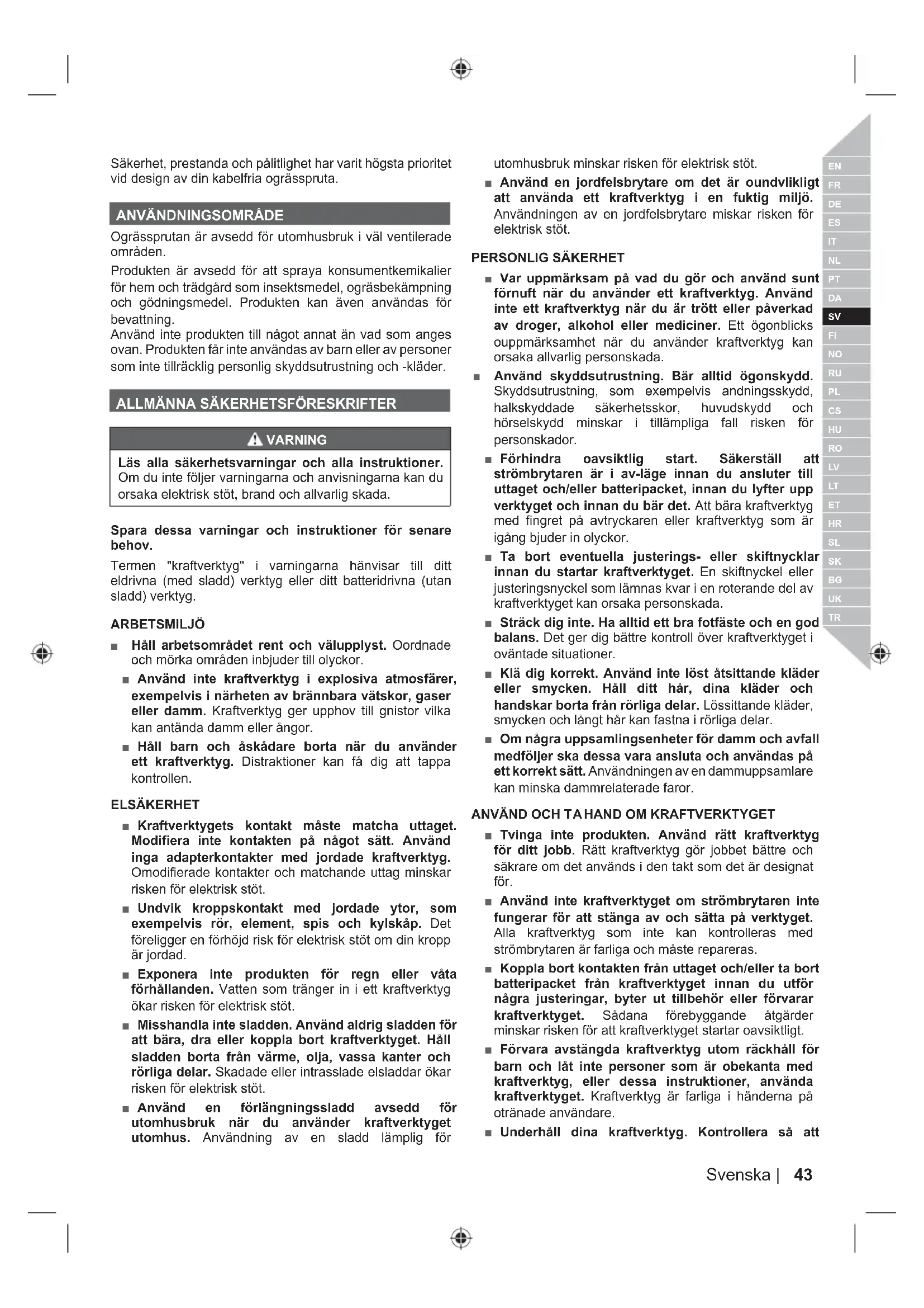 VARNING Läs alla säkerhetsvarningar och alla instruktioner. Om du inte följer varningarna och anvisningarna kan du orsaka elektrisk stöt, brand och allvarlig skada. Spara dessa varningar och instruktioner för senare behov. Termen "kraftverktyg" i varningarna hänvisar till ditt eldrivna (med sladd) verktyg eller ditt batteridrivna (utan sladd) verktyg. ARBETSMILJÖ ■ Håll arbetsområdet rent och välupplyst. Oordnade och mörka områden inbjuder till olyckor. ■ Använd inte kraftverktyg i explosiva atmosfärer, exempelvis i närheten av brännbara vätskor, gaser eller damm. Kraftverktyg ger upphov till gnistor vilka kan antända damm eller ångor. ■ Håll barn och åskådare borta när du använder ett kraftverktyg. Distraktioner kan få dig att tappa kontrollen. ELSÄKERHET ■ Kraftverktygets kontakt måste matcha uttaget. Modifiera inte kontakten på något sätt. Använd inga adapterkontakter med jordade kraftverktyg. Omodifierade kontakter och matchande uttag minskar risken för elektrisk stöt. ■ Undvik kroppskontakt med jordade ytor, som exempelvis rör, element, spis och kylskåp. Det föreligger en förhöjd risk för elektrisk stöt om din kropp är jordad. ■ Exponera inte produkten för regn eller våta förhållanden. Vatten som tränger in i ett kraftverktyg ökar risken för elektrisk stöt. ■ Misshandla inte sladden. Använd aldrig sladden för att bära, dra eller koppla bort kraftverktyget. Håll sladden borta från värme, olja, vassa kanter och rörliga delar. Skadade eller intrasslade elsladdar ökar risken för elektrisk stöt. ■ Använd en förlängningssladd avsedd för utomhusbruk när du använder kraftverktyget utomhus. Användning av en sladd lämplig för utomhusbruk minskar risken för elektrisk stöt. ■ Använd en jordfelsbrytare om det är oundvlikligt att använda ett kraftverktyg i en fuktig miljö. Användningen av en jordfelsbrytare miskar risken för elektrisk stöt.