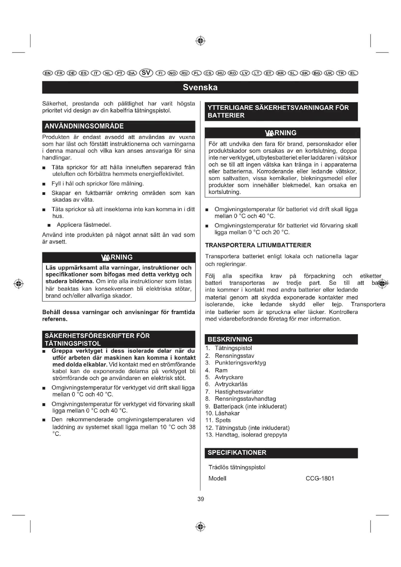 SPECIFIKATIONER Trådlös tätningspistol Modell CCG-180140 Svenska