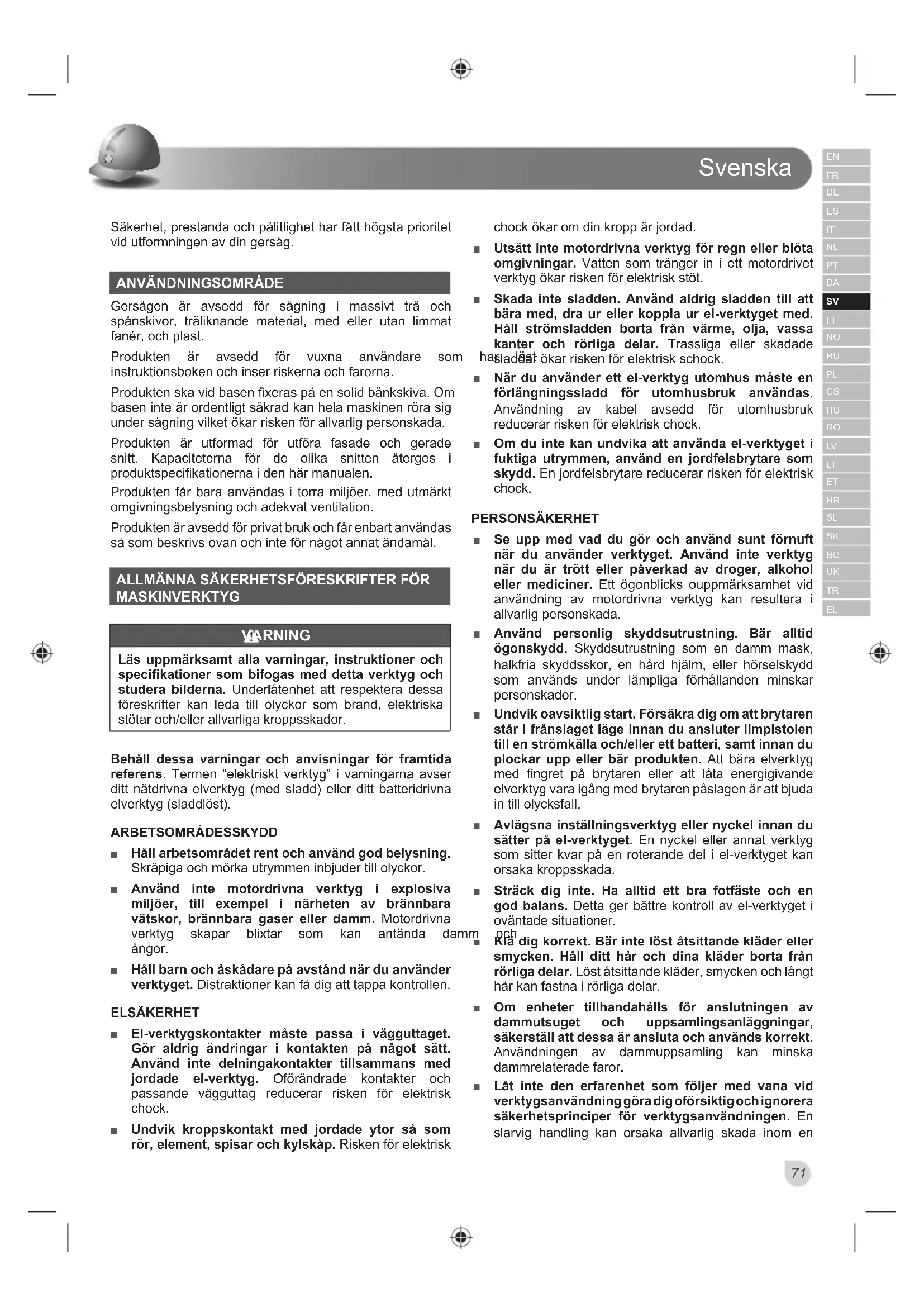Gersågen är avsedd för sågning i massivt trä och spånskivor, träliknande material, med eller utan limmat fanér, och plast. 3URGXNWHQ lU DYVHGG I|U YX[QD DQYlQGDUH VRP KDU OlVW instruktionsboken och inser riskerna och farorna. 3URGXNWHQVNDYLGEDVHQ¿[HUDVSnHQVROLGElQNVNLYD2P basen inte är ordentligt säkrad kan hela maskinen röra sig under sågning vilket ökar risken för allvarlig personskada. Produkten är utformad för utföra fasade och gerade snitt. Kapaciteterna för de olika snitten återges i SURGXNWVSHFL¿NDWLRQHUQDLGHQKlUPDQXDOHQ Produkten får bara användas i torra miljöer, med utmärkt omgivningsbelysning och adekvat ventilation. Produkten är avsedd för privat bruk och får enbart användas så som beskrivs ovan och inte för något annat ändamål. ALLMÄNNA SÄKERHETSFÖRESKRIFTER FÖR MASKINVERKTYG VARNING Läs uppmärksamt alla varningar, instruktioner och specifikationer som bifogas med detta verktyg och studera bilderna. Underlåtenhet att respektera dessa föreskrifter kan leda till olyckor som brand, elektriska VW|WDURFKHOOHUDOOYDUOLJDNURSSVVNDGRU Behåll dessa varningar och anvisningar för framtida referens. Termen ”elektriskt verktyg” i varningarna avser ditt nätdrivna elverktyg (med sladd) eller ditt batteridrivna elverktyg (sladdlöst). ARBETSOMRÅDESSKYDD Ŷ Håll arbetsområdet rent och använd god belysning. Skräpiga och mörka utrymmen inbjuder till olyckor. Ŷ Använd inte motordrivna verktyg i explosiva miljöer, till exempel i närheten av brännbara vätskor, brännbara gaser eller damm. Motordrivna YHUNW\J VNDSDU EOL[WDU VRP NDQ DQWlQGD GDPP RFK ångor. Ŷ Håll barn och åskådare på avstånd när du använder verktyget. Distraktioner kan få dig att tappa kontrollen. ELSÄKERHET Ŷ El-verktygskontakter måste passa i vägguttaget. Gör aldrig ändringar i kontakten på något sätt. Använd inte delningakontakter tillsammans med jordade el-verktyg. Oförändrade kontakter och passande vägguttag reducerar risken för elektrisk chock. Ŷ Undvik kroppskontakt med jordade ytor så som rör, element, spisar och kylskåp. Risken för elektrisk chock ökar om din kropp är jordad. Ŷ Utsätt inte motordrivna verktyg för regn eller blöta omgivningar. Vatten som tränger in i ett motordrivet verktyg ökar risken för elektrisk stöt. Ŷ Skada inte sladden. Använd aldrig sladden till att bära med, dra ur eller koppla ur el-verktyget med. Håll strömsladden borta från värme, olja, vassa kanter och rörliga delar. Trassliga eller skadade sladdar ökar risken för elektrisk schock. Ŷ När du använder ett el-verktyg utomhus måste en förlängningssladd för utomhusbruk användas. Användning av kabel avsedd för utomhusbruk reducerar risken för elektrisk chock. Ŷ Om du inte kan undvika att använda el-verktyget i fuktiga utrymmen, använd en jordfelsbrytare som skydd. En jordfelsbrytare reducerar risken för elektrisk chock. PERSONSÄKERHET Ŷ Se upp med vad du gör och använd sunt förnuft när du använder verktyget. Använd inte verktyg när du är trött eller påverkad av droger, alkohol eller mediciner. Ett ögonblicks ouppmärksamhet vid användning av motordrivna verktyg kan resultera i allvarlig personskada. Ŷ Använd personlig skyddsutrustning. Bär alltid ögonskydd. Skyddsutrustning som en damm mask, halkfria skyddsskor, en hård hjälm, eller hörselskydd som används under lämpliga förhållanden minskar personskador. Ŷ Undvik oavsiktlig start. Försäkra dig om att brytaren står i frånslaget läge innan du ansluter limpistolen till en strömkälla och/eller ett batteri, samt innan du plockar upp eller bär produkten. Att bära elverktyg med fingret på brytaren eller att låta energigivande elverktyg vara igång med brytaren påslagen är att bjuda in till olycksfall. Ŷ Avlägsna inställningsverktyg eller nyckel innan du sätter på el-verktyget. En nyckel eller annat verktyg som sitter kvar på en roterande del i el-verktyget kan orsaka kroppsskada. Ŷ Sträck dig inte. Ha alltid ett bra fotfäste och en god balans. Detta ger bättre kontroll av el-verktyget i oväntade situationer. Ŷ Klä dig korrekt. Bär inte löst åtsittande kläder eller smycken. Håll ditt hår och dina kläder borta från rörliga delar. Löst åtsittande kläder, smycken och långt hår kan fastna i rörliga delar. Ŷ Om enheter tillhandahålls för anslutningen av dammutsuget och uppsamlingsanläggningar, säkerställ att dessa är ansluta och används korrekt. Användningen av dammuppsamling kan minska dammrelaterade faror. Ŷ Låt inte den erfarenhet som följer med vana vid verktygsanvändning göra dig oförsiktig och ignorera säkerhetsprinciper för verktygsanvändningen. En slarvig handling kan orsaka allvarlig skada inom enSvenska