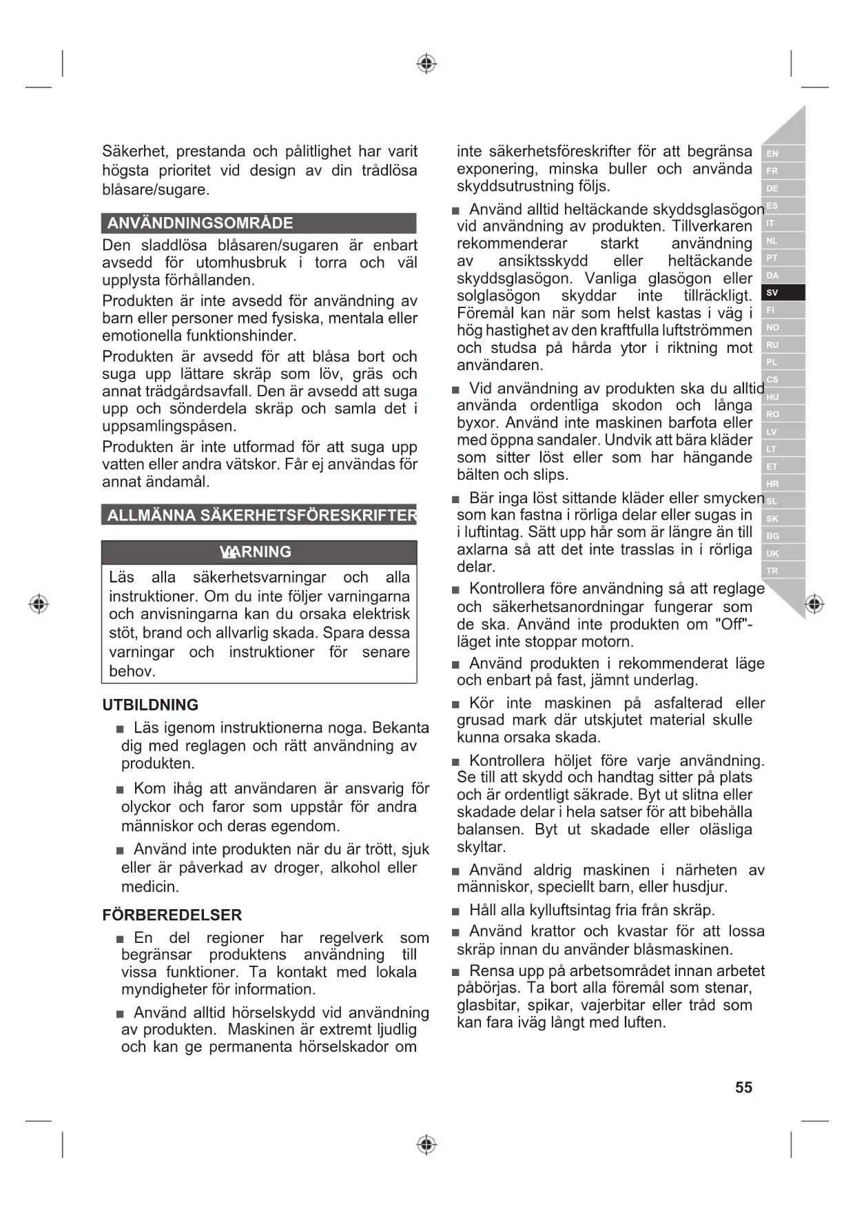 BLÅSARE ■ Använd en ansiktsmask om förhållandena är dammiga. Det minskar risken för skador på grund av damminandning. ■ Om det är dammigt ska du fukta ytorna innan arbetet. ■ Använd inte apparaten i närheten av öppna fönster. ■ Använd hela blåsmunstycket så att luftströmmen kommer nära marken och är effektiv. ■ Rikta inte utblåsmunstycket mot andra människor eller djur. ■ Placera aldrig föremål i blåsrören. ■ Placera inte produkten ovanpå eller nära löst skräp. Skräp kan sugas in i luftintaget och eventuellt skada enheten. ■ Stäng omedelbart av produkten och plocka ur batteripaketet vid olycksfall eller fel. Använd inte produkten igen innan den har kontrollerats i sin helhet av en auktoriserad serviceverkstad. ■ Använd en ansiktsmask om förhållandena är dammiga. Det minskar risken för skador på grund av damminandning. ■ Om det är dammigt ska du fukta ytorna innan arbetet. ■ Använd inte apparaten i närheten av öppna fönster. ■ Använd hela blåsmunstycket så att luftströmmen kommer nära marken och är effektiv. ■ Rikta inte utblåsmunstycket mot andra människor eller djur. ■ Placera aldrig föremål i blåsrören. ■ Placera inte produkten ovanpå eller nära löst skräp. Skräp kan sugas in i luftintaget och eventuellt skada enheten.
