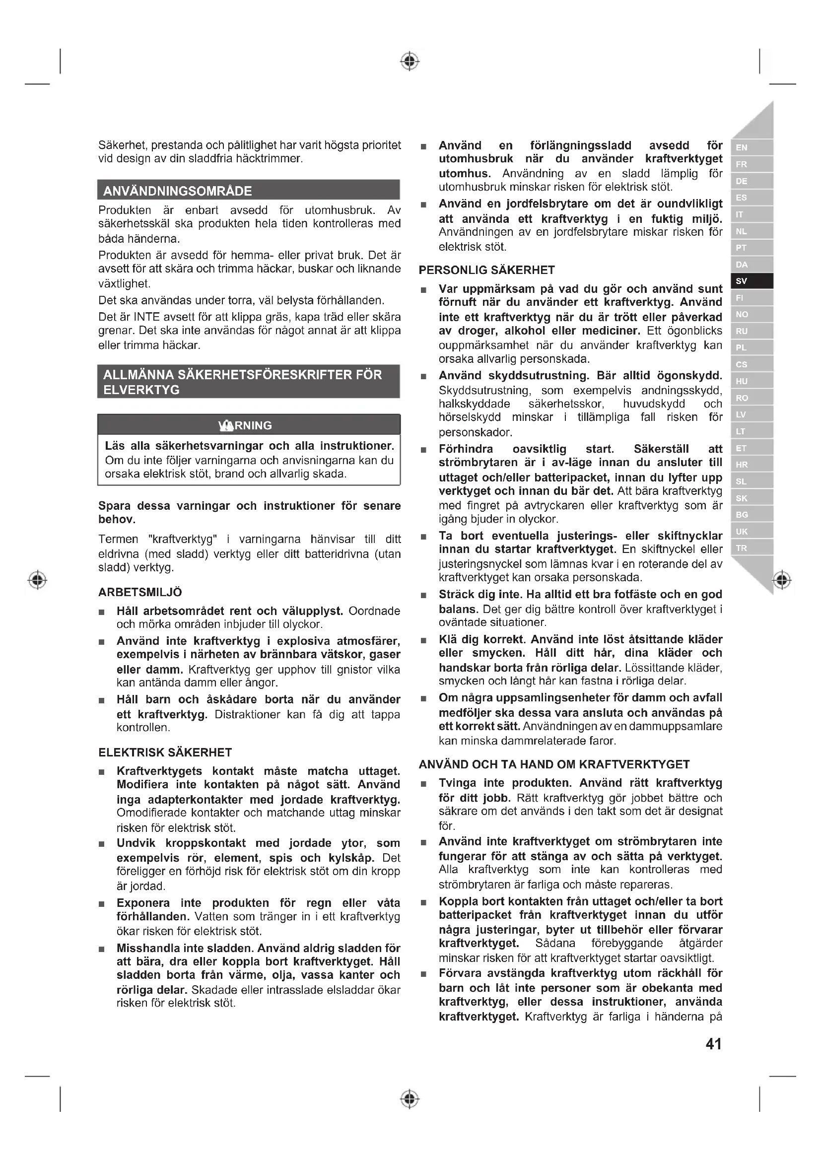 Produkten är enbart avsedd för utomhusbruk. Av säkerhetsskäl ska produkten hela tiden kontrolleras med båda händerna. Produkten är avsedd för hemma- eller privat bruk. Det är avsett för att skära och trimma häckar, buskar och liknande växtlighet. Det ska användas under torra, väl belysta förhållanden. Det är INTE avsett för att klippa gräs, kapa träd eller skära grenar. Det ska inte användas för något annat är att klippa eller trimma häckar. ALLMÄNNA SÄKERHETSFÖRESKRIFTER FÖR ELVERKTYG VARNING Läs alla säkerhetsvarningar och alla instruktioner. Om du inte följer varningarna och anvisningarna kan du orsaka elektrisk stöt, brand och allvarlig skada. Spara dessa varningar och instruktioner för senare behov. Termen "kraftverktyg" i varningarna hänvisar till ditt eldrivna (med sladd) verktyg eller ditt batteridrivna (utan sladd) verktyg. ARBETSMILJÖ ■ Håll arbetsområdet rent och välupplyst. Oordnade och mörka områden inbjuder till olyckor. ■ Använd inte kraftverktyg i explosiva atmosfärer, exempelvis i närheten av brännbara vätskor, gaser eller damm. Kraftverktyg ger upphov till gnistor vilka kan antända damm eller ångor. ■ Håll barn och åskådare borta när du använder ett kraftverktyg. Distraktioner kan få dig att tappa kontrollen.