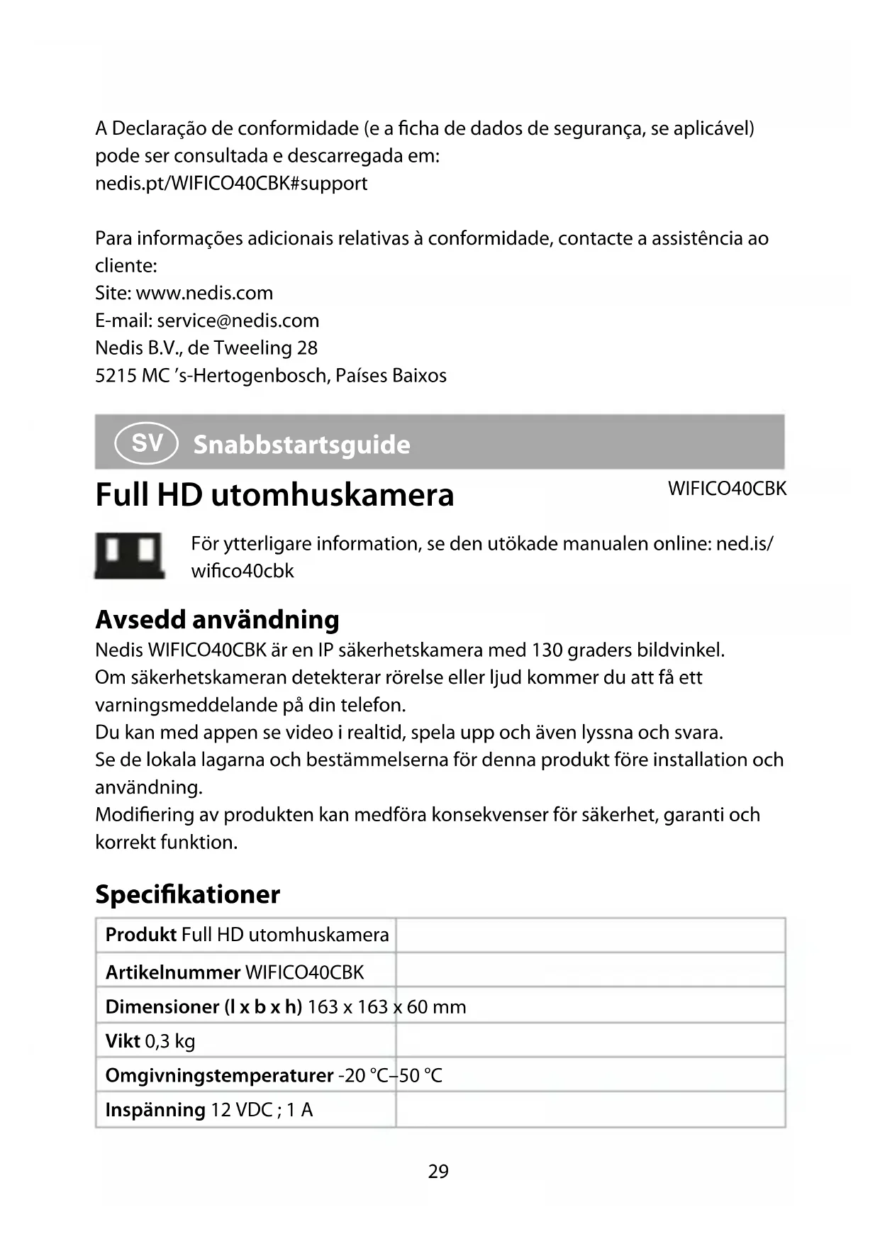 WIFICO40CBK - Övervakningskamera NEDIS - Gratis bruksanvisning och manual
