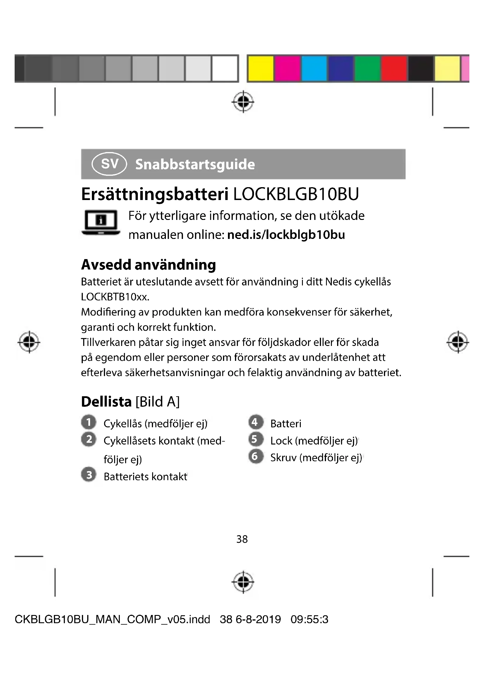 Snabbstartsguide Ersättningsbatteri LOCKBLGB10BU För ytterligare information, se den utökade manualen online: ned.is/lockblgb10bu Avsedd användning Batteriet är uteslutande avsett för användning i ditt Nedis cykellås LOCKBTB10xx. Modiering av produkten kan medföra konsekvenser för säkerhet, garanti och korrekt funktion. Tillverkaren påtar sig inget ansvar för följdskador eller för skada på egendom eller personer som förorsakats av underlåtenhet att efterleva säkerhetsanvisningar och felaktig användning av batteriet. Dellista [Bild A] Batteri 5 Lock (medföljer ej)6 Skruv (medföljer ej) Säkerhetsanvisningar