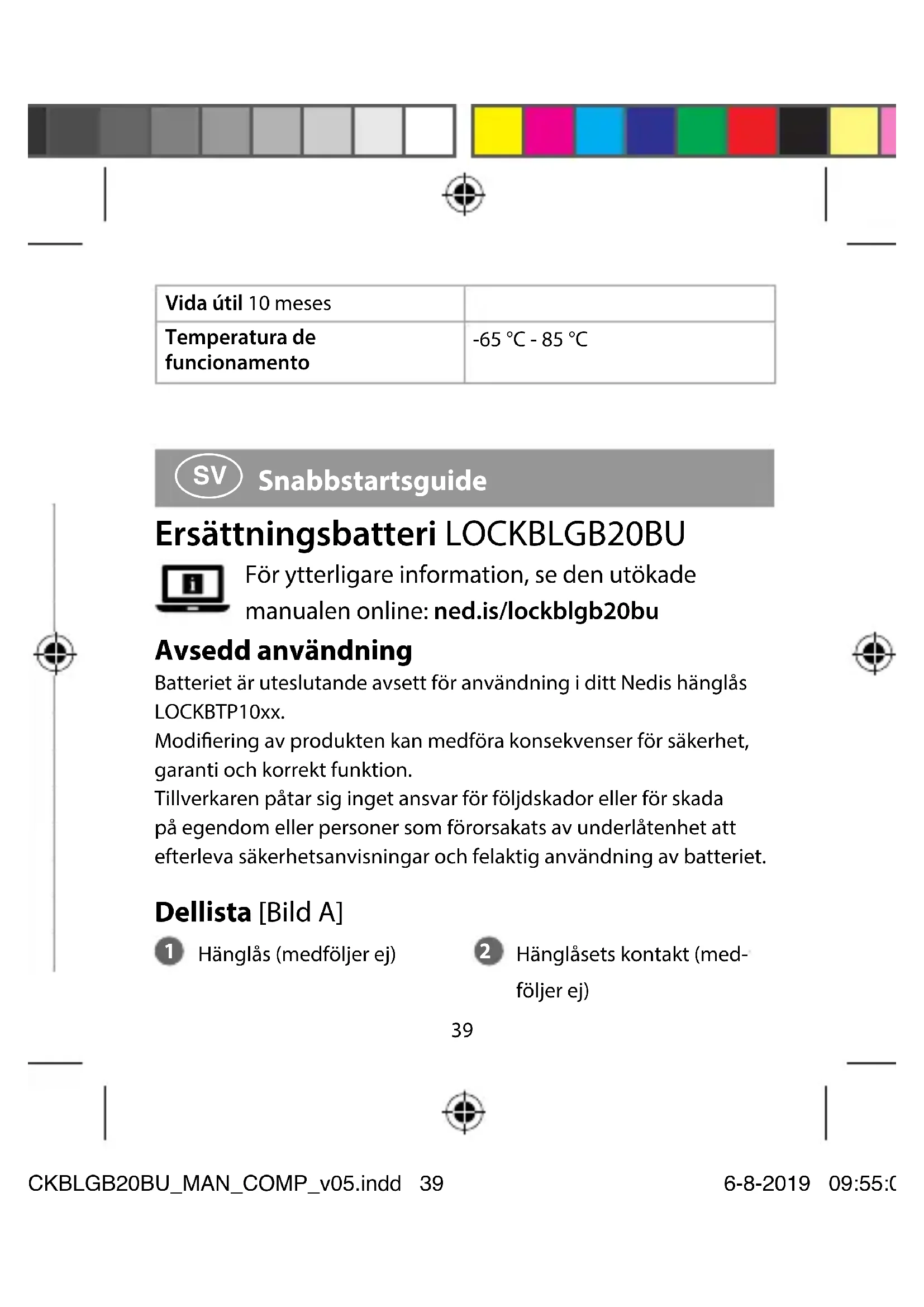 Snabbstartsguide Ersättningsbatteri LOCKBLGB20BU För ytterligare information, se den utökade manualen online: ned.is/lockblgb20bu Avsedd användning Batteriet är uteslutande avsett för användning i ditt Nedis hänglås LOCKBTP10xx. Modiering av produkten kan medföra konsekvenser för säkerhet, garanti och korrekt funktion. Tillverkaren påtar sig inget ansvar för följdskador eller för skada på egendom eller personer som förorsakats av underlåtenhet att efterleva säkerhetsanvisningar och felaktig användning av batteriet. Dellista [Bild A]