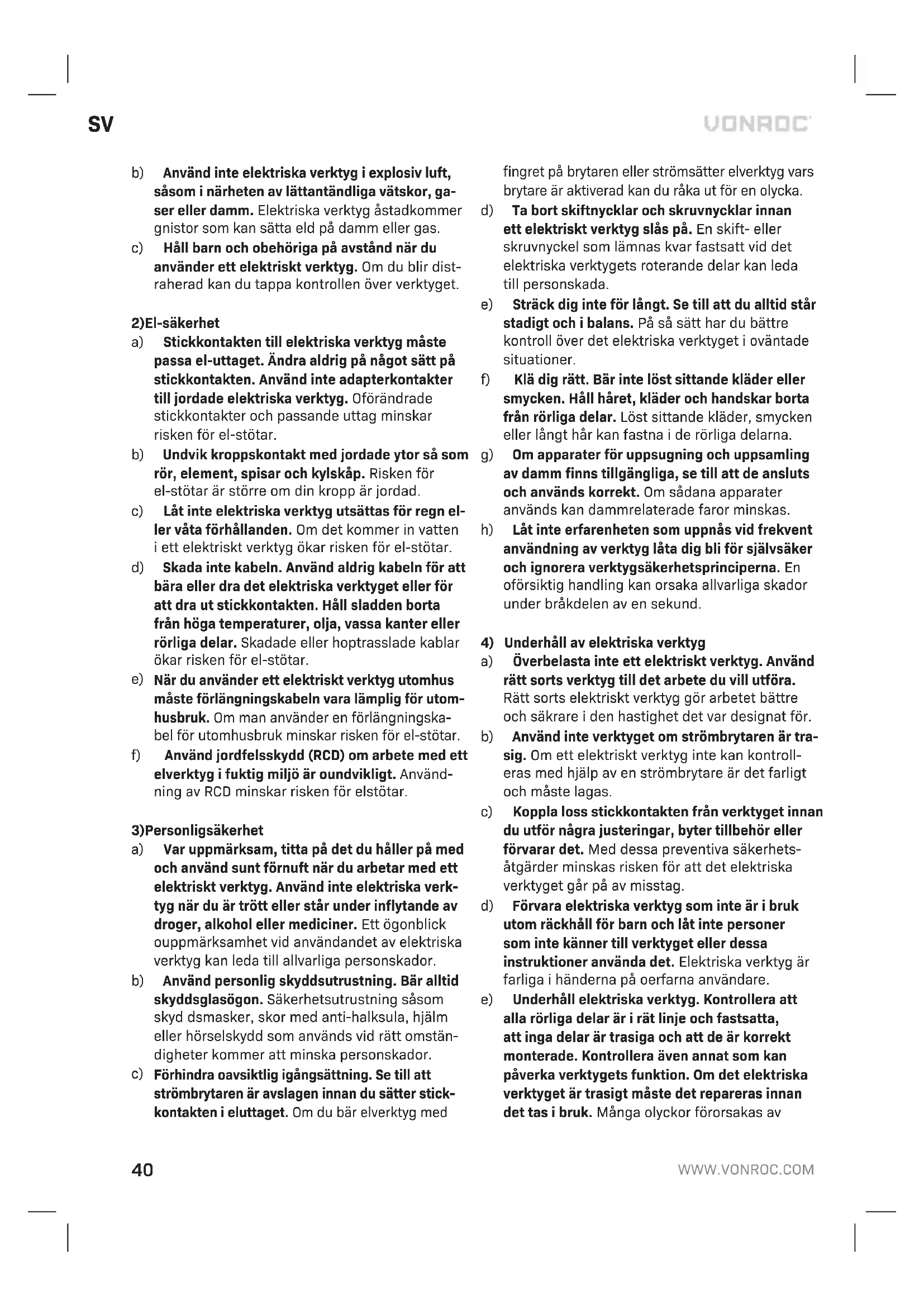 Innan rengöring och underhåll ska du alltid stänga av maskinen och dra ut nätkontak- ten ur vägguttaget. Rengör maskinen hus regelbundet med en mjuk tra- sa, helst efter varje gång du använder maskinen. Se till att ventilationsöppningarna är fria från damm och smuts. Ta bort mycket ihållande smuts med en mjuk trasa fuktad med tvållösning. Använd inte lösnings- medel som bensin, alkohol, ammoniak osv. Sådana kemikalier skadar de syntetiska komponenterna. MILJÖ Felaktig och/eller kasserad elektrisk eller elektronisk utrustning måste lämnas in på lämpliga återvinningsstationer. Endast för EU-länder Släng inte elverktyg i hushållsavfallet. Enligt det europeiska WEEE-direktivet 2012/19/EU för avfall från elektrisk och elektronisk utrustning och dess tillämpning nationellt ska elverktyg som inte längre kan användas samlas in separat och kasseras på ett miljövänligt sätt. GARANTI VONROC produkter är utvecklade enligt högsta kva- litetsstandard och garanteras vara utan defekter både vad gäller material och tillverkning under den period som stipuleras enligt lag med början från ursprungligt inköpsdatum. Om något fel uppstår på produkten under denna period på grund av material- och/eller tillverkningsfel skall VONROC kontaktas direkt. Följande omständigheter exkluderas från denna garanti: