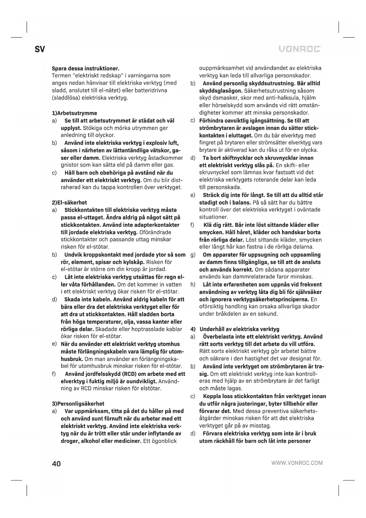 MILJÖ Felaktig och/eller kasserad elektrisk eller elektronisk utrustning måste lämnas in på lämpliga återvinningsstationer. Endast för EU-länder Kassera inte elverktyg i hushållsavfall. Enligt den europeiska riktlinjen 2012/19/EU om kasserad elektrisk och elektronisk utrustning och dess tillämpning i nationell rätt måste elverktyg som inte längre är användbara samlas in separat och kasseras på ett miljövänligt sätt. GARANTI VONROC produkter är utvecklade enligt högsta kva- litetsstandard och garanteras vara utan defekter både vad gäller material och tillverkning under den period som stipuleras enligt lag med början från ursprungligt inköpsdatum. Om något fel uppstår på produkten under denna period på grund av material- och/eller tillverkningsfel skall VONROC kontaktas direkt. Följande omständigheter exkluderas från denna garanti: