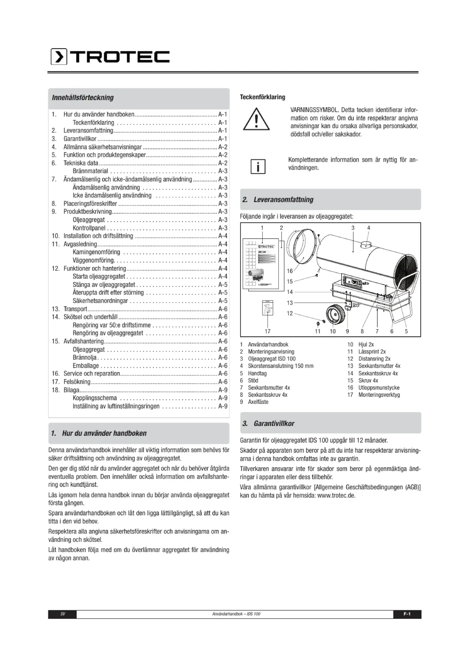 Garantin för oljeaggregatet IDS 100 uppgår till 12 månader. Skador på apparaten som beror på att du inte har respekterar anvisning- arna i denna handbok omfattas inte av garantin. Tillverkaren ansvarar inte för skador som beror på egenmäktiga änd- ringar i apparaten eller dess tillbehör. Våra allmänna garantivillkor [Allgemeine Geschäftsbedingungen (AGB)] kan du hämta på vår hemsida: www.trotec.de.Användarhandbok – IDS 100 F-2 SV