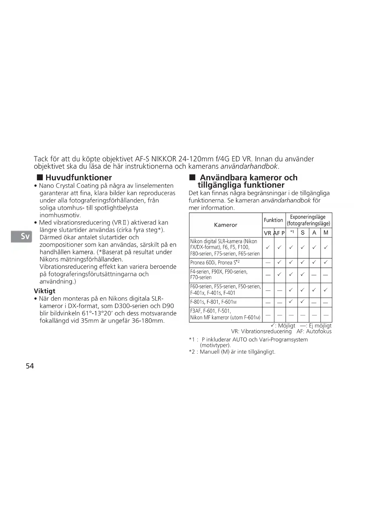 3: Möjligt —: Ej möjligt VR: Vibrationsreducering AF: Autofokus *1 : P inkluderar AUTO och Vari-Programsystem (motivtyper). *2 : Manuell (M) är inte tillgängligt. Tack för att du köpte objektivet AF-S NIKKOR 24-120mm f/4G ED VR. Innan du använder objektivet ska du läsa de här instruktionerna och kamerans användarhandbok. Huvudfunktioner