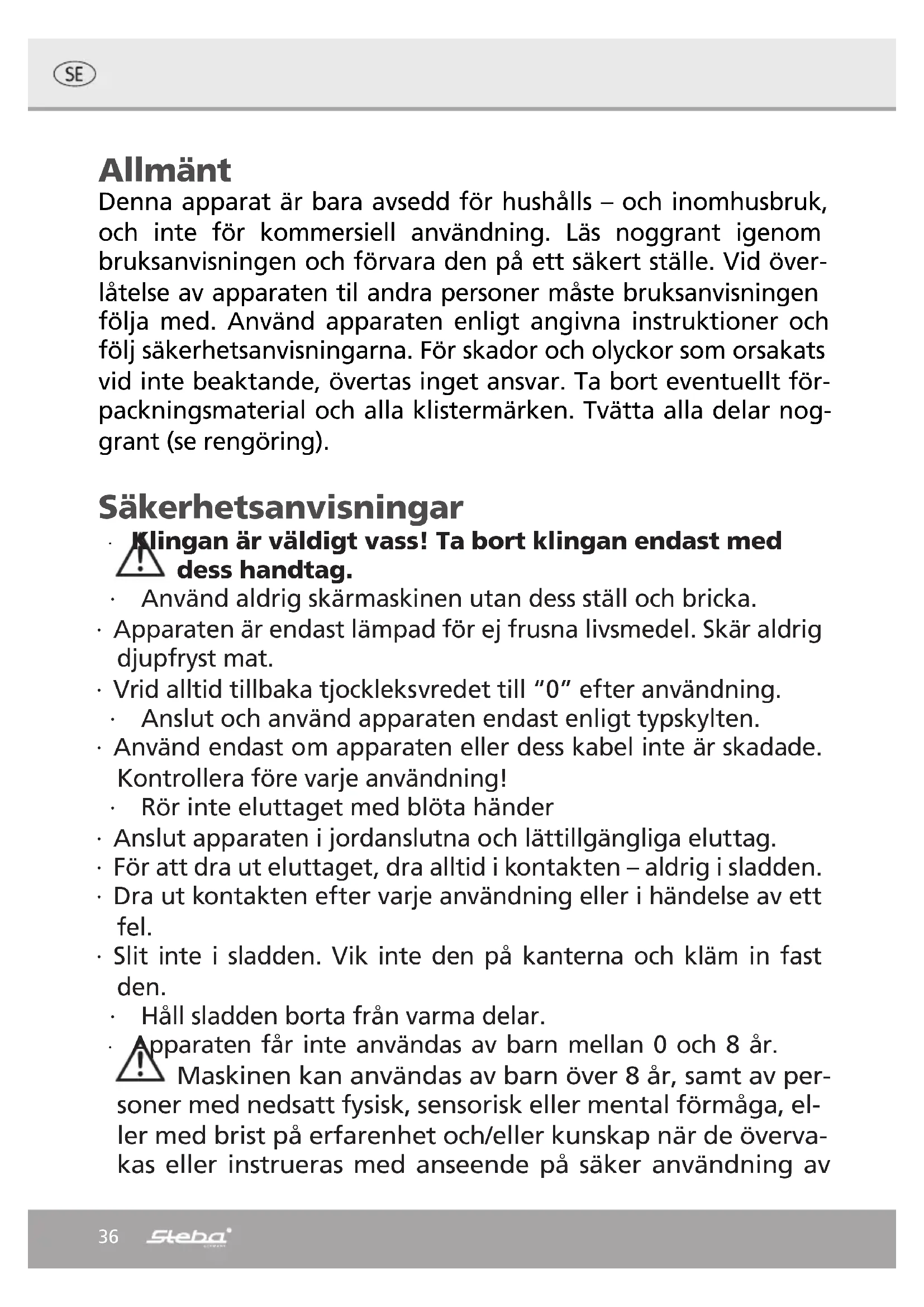Denna apparat ar bara avsedd for hushålls - och inomhusbruk, och inte for kommersiell användning. Läs noggrant ingenbruksanvisningen och Förvara den på att sakerstätte. Vid overlåtelse av apparaten til andra personer maste bruksanvisningen följa med. Använd apparaten enligt angivna instruktioner och följ sakerhetsanvisningarna. För skador och olyckor som orsakats vid inte beaktande, övertas inget ansvar. Ta bort eventuellt forpackningsmaterial och alla klistermärken. Tvätta alla delar noggrant (se rengöring).
