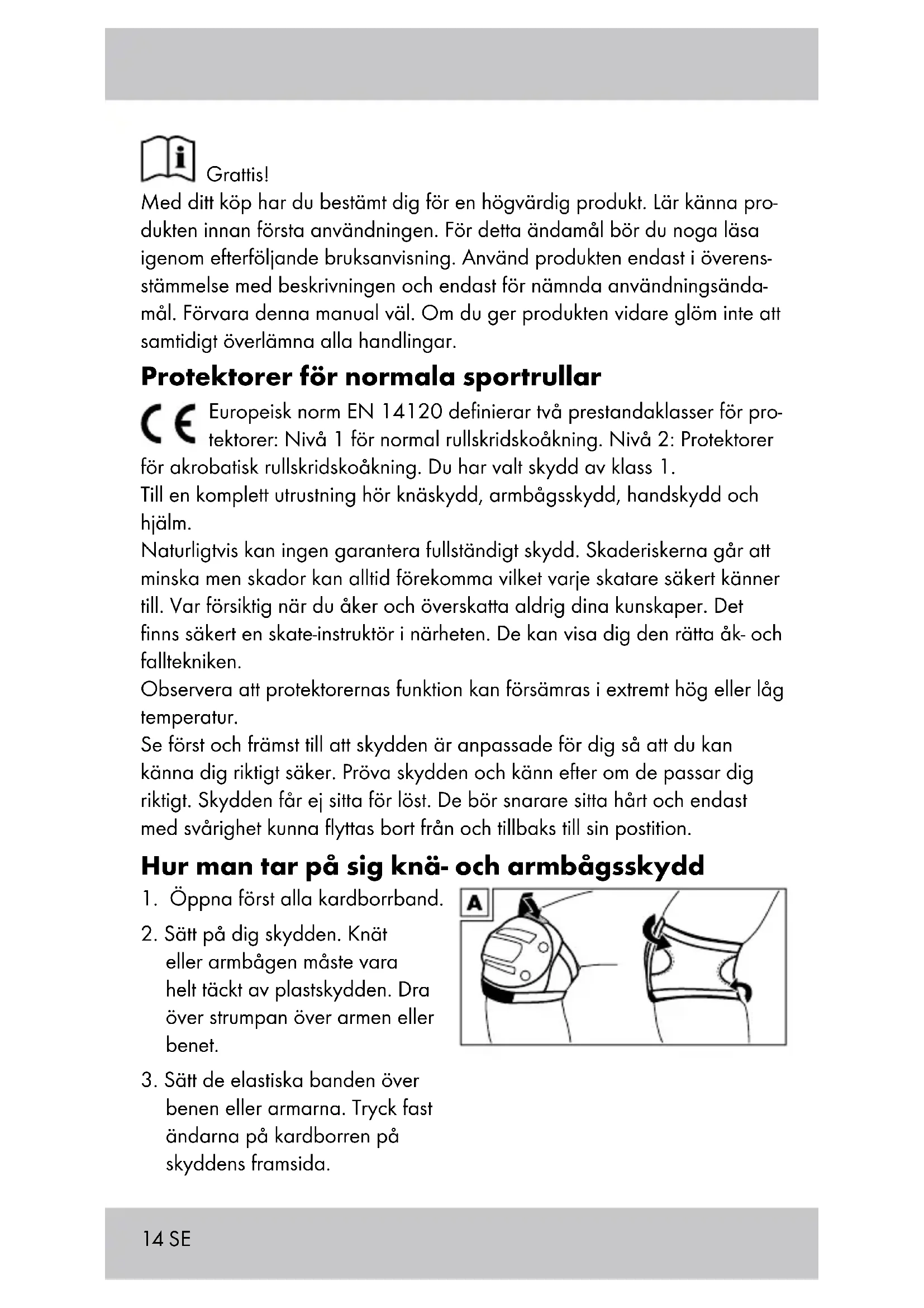 Wragekamp 6, D-22397 Hamburg Valmistusvuosi: 2015 EU-rakennemallikoestus standardin EN 14120:2003 + A1:2007 Taso 1 (tavallisen rullaurheilun suojukset) Alue A (alle 25 kg painavien käyttäjien suojukset) Koko 3-7 vuotta (100 -130 cm) Alue B (Suojukset rullaluistelijoille, joiden paino on 25-50 kg) Koko 8-12 vuotta (130 -160 cm) Katsastettu TÜV Rheinland LGA Products GmbH Tillystr. 2, D-90431 Nürnberg, Germany Notified body no. 019714 SE Grattis! Med ditt köp har du bestämt dig för en högvärdig produkt. Lär känna pro- dukten innan första användningen. För detta ändamål bör du noga läsa igenom efterföljande bruksanvisning. Använd produkten endast i överens- stämmelse med beskrivningen och endast för nämnda användningsända- mål. Förvara denna manual väl. Om du ger produkten vidare glöm inte att samtidigt överlämna alla handlingar. Protektorer för normala sportrullar Europeisk norm EN 14120 definierar två prestandaklasser för pro- tektorer: Nivå 1 för normal rullskridskoåkning. Nivå2: Protektorer för akrobatisk rullskridskoåkning. Du har valt skydd av klass 1. Till en komplett utrustning hör knäskydd, armbågsskydd, handskydd och hjälm. Naturligtvis kan ingen garantera fullständigt skydd. Skaderiskerna går att minska men skador kan alltid förekomma vilket varje skatare säkert känner till. Var försiktig när du åker och överskatta aldrig dina kunskaper. Det finns säkert en skate-instruktör i närheten. De kan visa dig den rätta åk- och falltekniken. Observera att protektorernas funktion kan försämras i extremt hög eller låg temperatur. Se först och främst till att skydden är anpassade för dig så att du kan känna dig riktigt säker. Pröva skydden och känn efter om de passar dig riktigt. Skydden får ej sitta för löst. De bör snarare sitta hårt och endast med svårighet kunna flyttas bort från och tillbaks till sin postition. Hur man tar på sig knä- och armbågsskydd