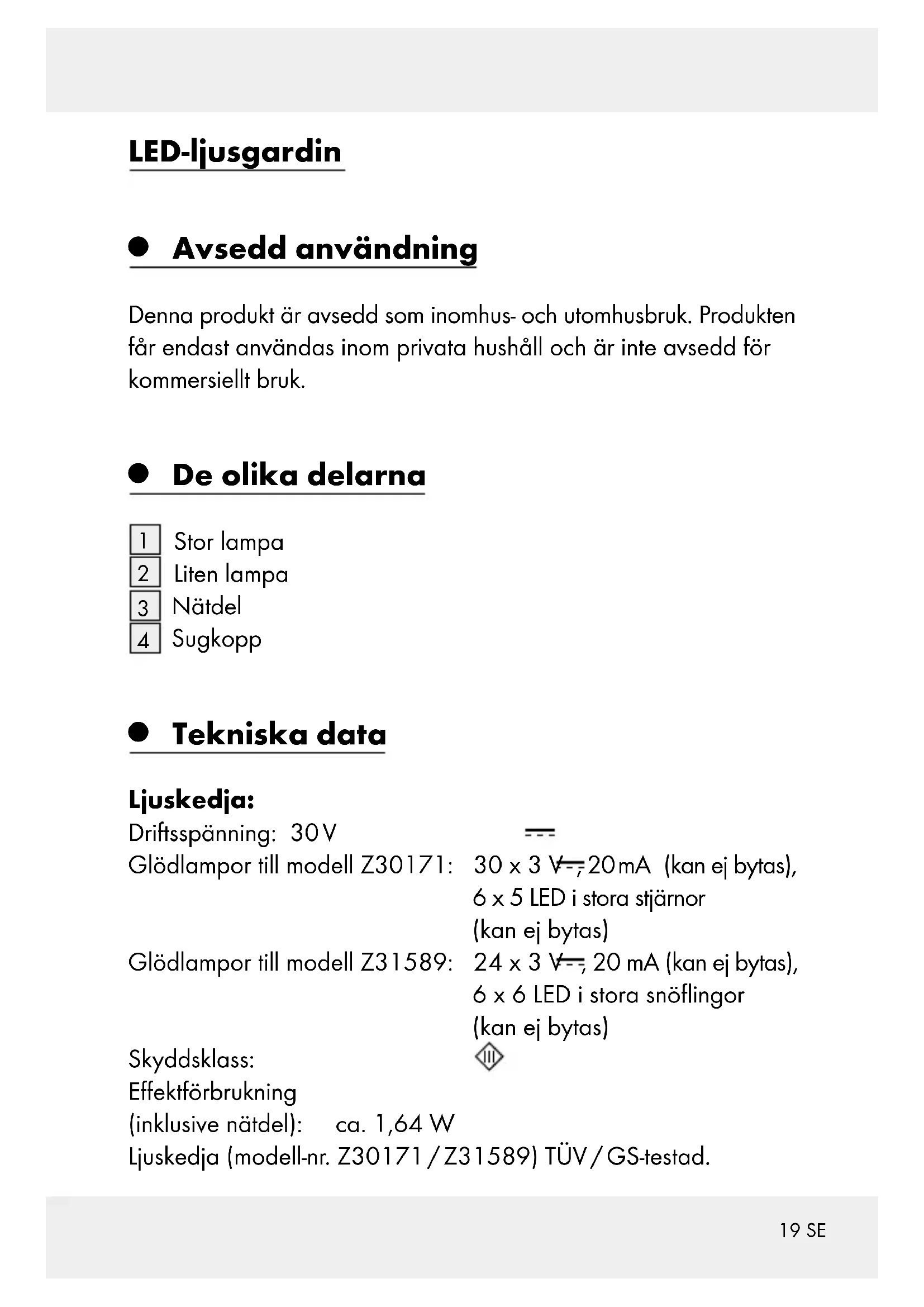 Tekniska data Ljuskedja: Driftsspänning: 30 V Glödlampor till modell Z30171: 30 x 3 V , 20 mA (kan ej bytas), 6 x 5 LED i stora stjärnor (kan ej bytas) Glödlampor till modell Z31589: 24 x 3 V , 20 mA (kan ej bytas), 6 x 6 LED i stora snöflingor (kan ej bytas) Skyddsklass: Effektförbrukning (inklusive nätdel): ca. 1,64 W Ljuskedja (modell-nr. Z30171 / Z31589) TÜV / GS-testad.20 SE Nätdel: Märkspänning ingång: 230–240 V