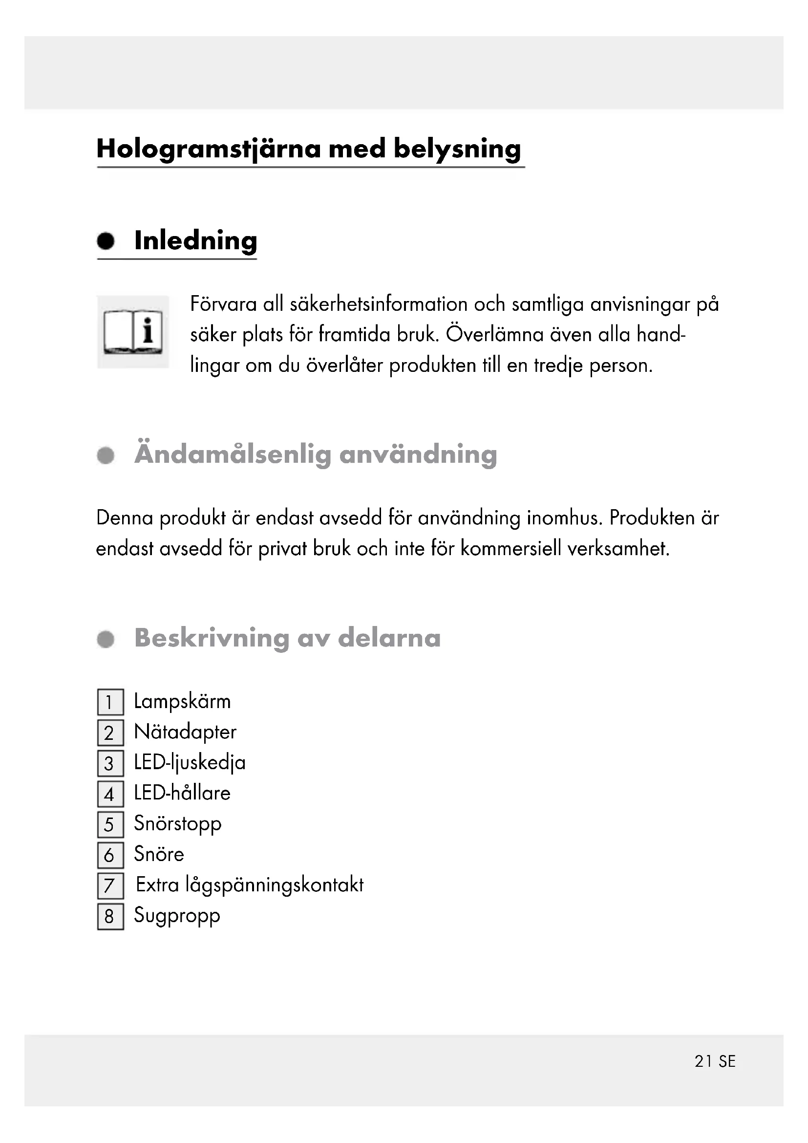 med hjälp av sugproppen. Hänvisning: Säkra ljuskedjans kabel, utan att skada den. Fäst aldrig med skarpa klämmor eller spik. Rengöring och skötsel SE UPP! RISK FÖR ELEKTRISKA STÖTAR! Börja med att dra ut nätkontakten ur vägguttaget. SE UPP! RISK FÖR ELEKTRISKA STÖTAR! Av säkerhetsskäl får produkten inte rengöras med vatten eller annan vätska och under inga omständigheter doppas i vatten. Använd inga lösningsmedel, bensin eller liknande. Produkten kan skadas. Använd endast en torr luddfri duk för rengöring.26 SE Avfallshantering Förpackningen består av miljövänliga material, som kan lämnas för avfallshantering på lokala återvinningsstationer. Information om var du kan lämna den uttjänta produkten för avfallshan- tering erhåller du hos kommunen. Var rädd om miljön och kasta inte den uttjänta produkten i hushållsavfallet utan säkerställ en fackmässig avfallshante- ring. Information om återvinningsstationer och deras öppetti- der erhåller du hos de lokala myndigheterna. Garanti Denna apparat har tillverkats med omsorg enligt stränga kvalitetskrav och kontrollerats noggrant före leverans. Om fel uppstår på produkten gäller dina lagstadgade rättigheter gentemot säljaren. Dessa lagstad- gade rättigheter begränsas inte av vår garanti, som redovisas nedan. Du erhåller 3 års garanti på denna apparat från och med köpdatum. Garantitiden börjar på inköpsda gen. Spara originalkvittot. Denna handling behövs som bevis för köpet. Om ett material- eller tillverkningsfel uppstår på produkten inom 3 år från köpdatum, reparerar eller ersätter vi efter eget gottfinnande produkten utan extra kostnad. Denna garanti förfaller om produkten skadas, an- vänds på fel sätt eller inte underhålls. Garantin gäller för material- eller tillverkningsfel. Denna garanti omfattar inte produktkomponenter som utsätts för normalt slitage och därför27 SE betraktas som slitdelar (t.ex. batterier). Uteslutna är även skador på ömtå- liga delar, som t.ex. brytare, batteripack eller delar tillverkade av glas.28 FR/BE Introduction Utilisation conforme ...................................................................Page 29 Descriptif des pièces ..................................................................Page 29 Caractéristiques techniques .......................................................Page 30 Contenu de la livraison ..............................................................Page 30 Indications de sécurité ................................................Page 31 Application ............................................................................Page 33 Nettoyage et entretien ............................................... Page 33 Mise au rebut ......................................................................Page 34 Garantie .................................................................................. Page 3429 FR/BE Étoile lumineuse à effet holographique Introduction Gardez toutes les consignes de sécurité et les instructions dans un endroit sûr. Lors d’une cession à un tiers, veuillez également remettre tous les documents associés. Utilisation conforme Ce produit est uniquement conçu pour un usage intérieur. Ce produit est destiné à un usage domestique uniquement et non à un usage commercial. Descriptif des pièces