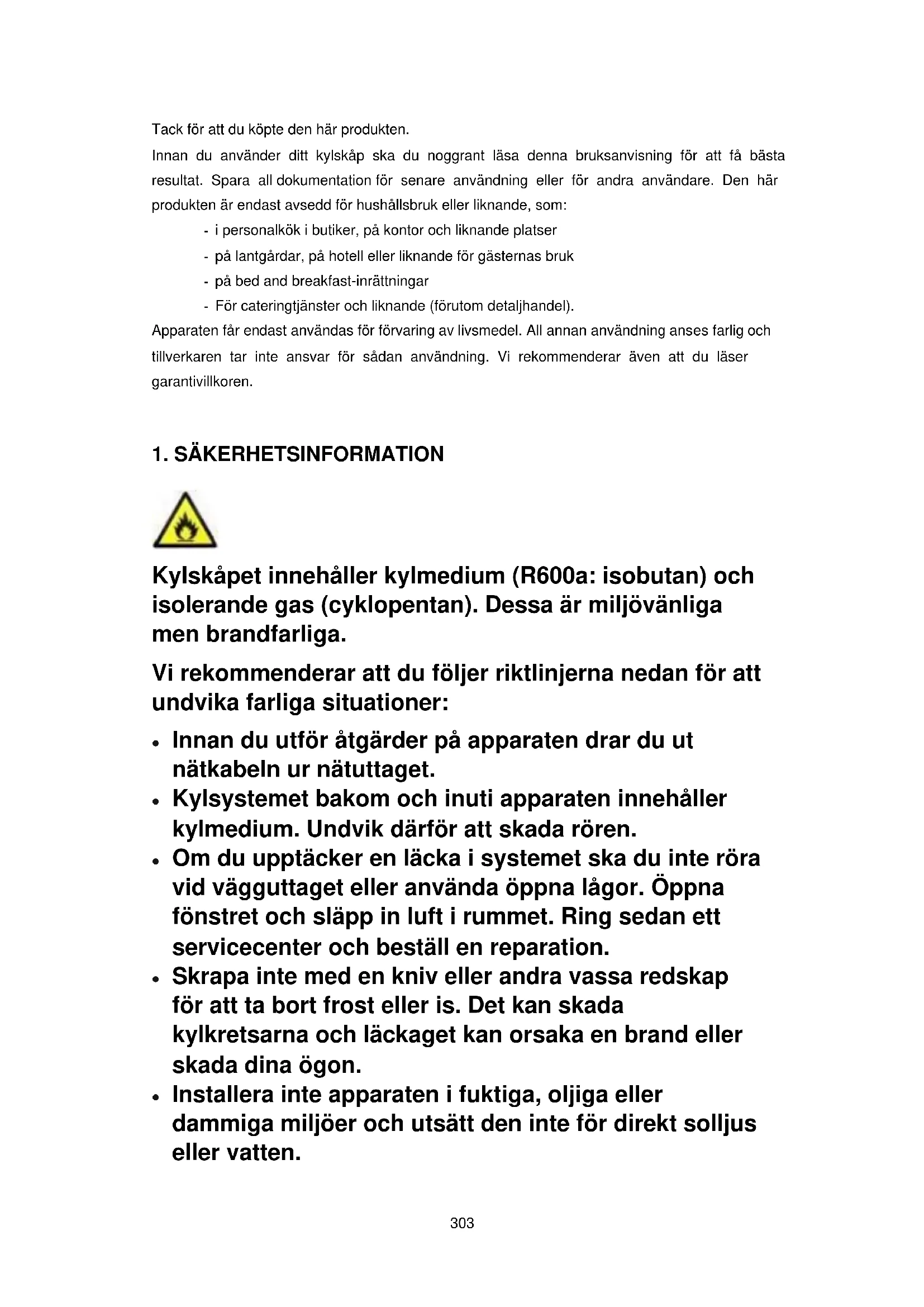 Kylskåpet innehåller kylmedium (R600a: isobutan) och isolerande gas (cyklopentan). Dessa är miljövänliga men brandfarliga. Vi rekommenderar att du följer riktlinjerna nedan för att undvika farliga situationer: