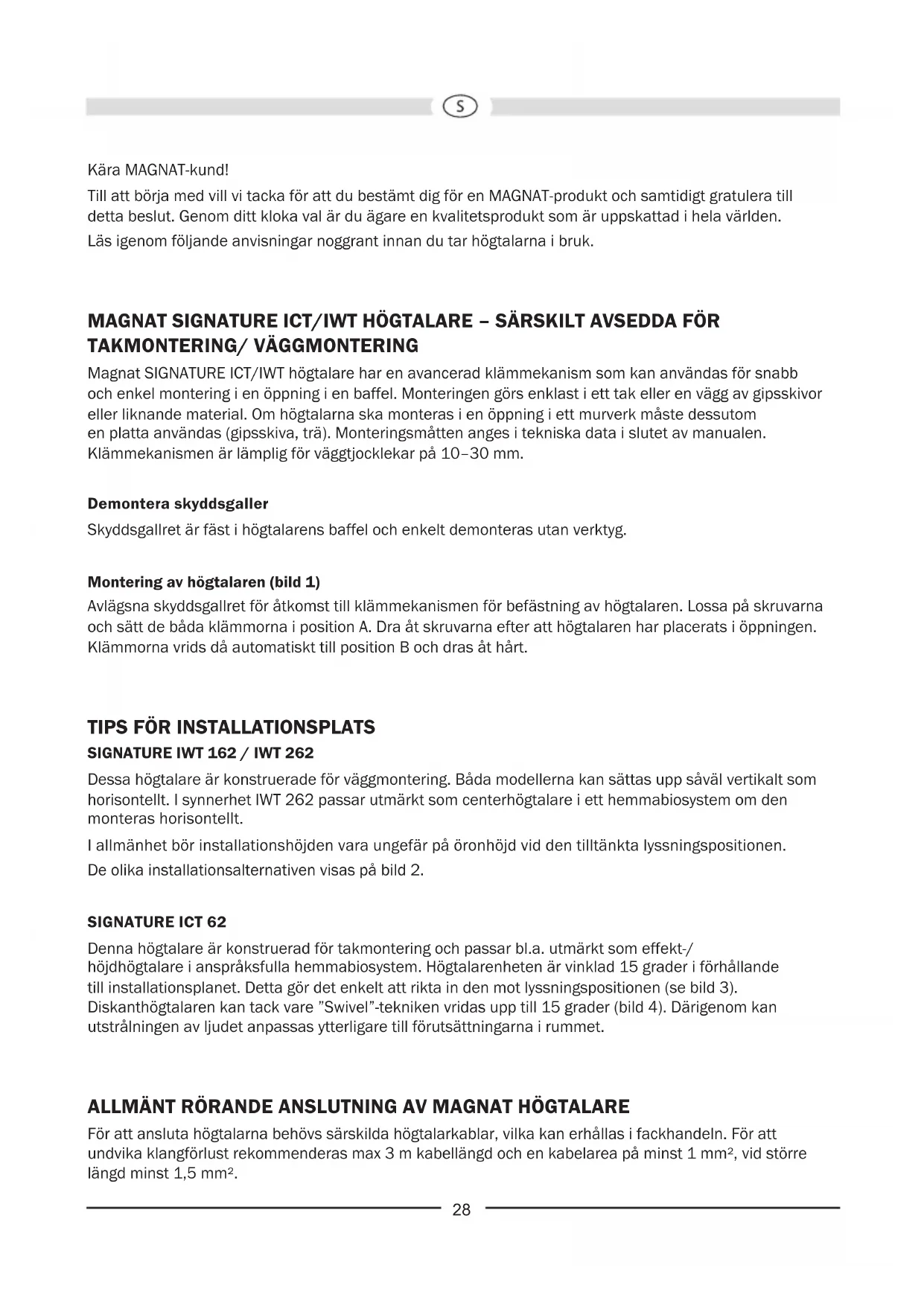 Dessa högtalare är konstruerade för väggmontering. Båda modellerna kan sättas upp såväl vertikalt som horisontellt. I synnerhet IWT 262 passar utmärkt som centerhögtalare i ett hemmabiosystem om den monteras horisontellt. I allmänhet bör installationshöjden vara ungefär på öronhöjd vid den tilltänkta lyssningspositionen. De olika installationsalternativen visas på bild 2. SIGNATURE ICT 62 Denna högtalare är konstruerad för takmontering och passar bl.a. utmärkt som effekt-/ höjdhögtalare i anspråksfulla hemmabiosystem. Högtalarenheten är vinklad 15 grader i förhållande till installationsplanet. Detta gör det enkelt att rikta in den mot lyssningspositionen (se bild 3). Diskanthögtalaren kan tack vare ”Swivel”-tekniken vridas upp till 15 grader (bild 4). Därigenom kan utstrålningen av ljudet anpassas ytterligare till förutsättningarna i rummet. ALLMÄNT RÖRANDE ANSLUTNING AV MAGNAT HÖGTALARE För att ansluta högtalarna behövs särskilda högtalarkablar, vilka kan erhållas i fackhandeln. För att undvika klangförlust rekommenderas max 3 m kabellängd och en kabelarea på minst 1 mm², vid större längd minst 1,5 mm².29 Förstärkaren resp receivern ska principiellt vara frånkopplade tills alla anslutningar gjorts. Ställ högtalarna på planerad plats för att mäta nödvändig kabellängd. Samma kabellängd bör användas för båda kanalerna. Avisolera kabeländarna med 10 – 15 mm och tvinna dem därefter. Högtalaranslutningarna är utrustade med en klämanordning (bild 5). Tryck på klämanslutningen och för in den avisolerade kabeltråden i hålet på sidan. Släpp klämanslutningen så att kabeln sitter fast säkert och har bästa möjliga elektriska kontakt. Beakta polningen vid anslutning av kablarna, dvs högtalarnas svarta (-) klämmor anslutas till förstärkarens minusklämmor och högtalarnas röda klämmor (+) till förstärkarens motsvarande plusklämmor. Vid vanliga högtalarkablar är en kabelledare räfad eller färgmarkerad för att underlätta anslutningen till rätt poler. Kontrollera igen att kablarna sitter fast ordentligt och att ingen kortslutning har bildats genom t ex utstickande ledare. Detta vore mycket farligt för den anslutna förstärkaren. DISKANTREGISTERINSTÄLLNING (BILD 6) Delningsfrekvensen kan ställas in via reglage av hög kvalitet på fronten vilket möjliggör individuell anpassning av ljudet i högtalarsystemet. Optimal inställning riktar sig efter den egna smaken. Vi rekommenderar följande positioner som grundinställning för olika hörutrymmen: Utrymme Exempel Position Lite ljuddämpande omgivning Hårt reekterande ytor, kakel, stora glasytor, rum med få möbler -3dB Normalt ljuddämpande omgivning Mattor, glasytor med gardiner, läder, rum med normal möblering 0dB Starkt ljuddämpande omgivning Mattor, polster, tunga gardiner, rum med omfattande möblering +3dB