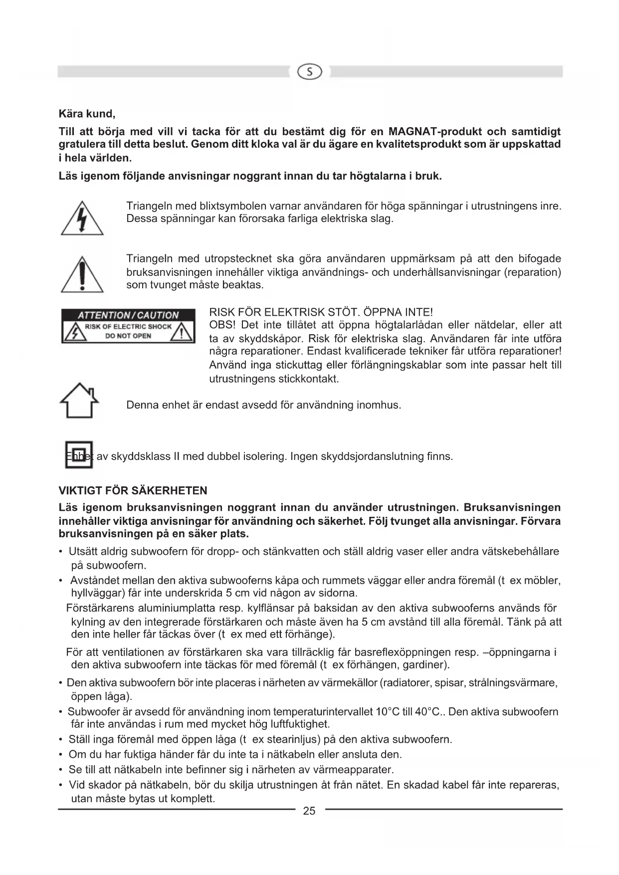 Configuração: Bassreflex subwoofer, ‚Frontfire‘ Equipamento Estágio excitador de curso longo de 30 cm Capacidade de saída RMS / Máx.: 220 / 440 Watt Faixa de frequência: 18...200 Hz Frequência de separação: 40...200 Hz regulável Dimensões (LxAxP): 400 x 570 x 510 mm Acessórios: Cabo de ligação à rede RESERVADOS OS DIREITOS DE ALTERAÇÕES TÉCNICAS.25 Kära kund, Till att börja med vill vi tacka för att du bestämt dig för en MAGNAT-produkt och samtidigt gratulera till detta beslut. Genom ditt kloka val är du ägare en kvalitetsprodukt som är uppskattad i hela världen. Läs igenom följande anvisningar noggrant innan du tar högtalarna i bruk. Triangeln med blixtsymbolen varnar användaren för höga spänningar i utrustningens inre. Dessa spänningar kan förorsaka farliga elektriska slag. Triangeln med utropstecknet ska göra användaren uppmärksam på att den bifogade bruksanvisningen innehåller viktiga användnings- och underhållsanvisningar (reparation) som tvunget måste beaktas. RISK FÖR ELEKTRISK STÖT. ÖPPNA INTE! OBS! Det inte tillåtet att öppna högtalarlådan eller nätdelar, eller att ta av skyddskåpor. Risk för elektriska slag. Användaren får inte utföra några reparationer. Endast kvalificerade tekniker får utföra reparationer! Använd inga stickuttag eller förlängningskablar som inte passar helt till utrustningens stickkontakt. Denna enhet är endast avsedd för användning inomhus. Enhet av skyddsklass II med dubbel isolering. Ingen skyddsjordanslutning finns.