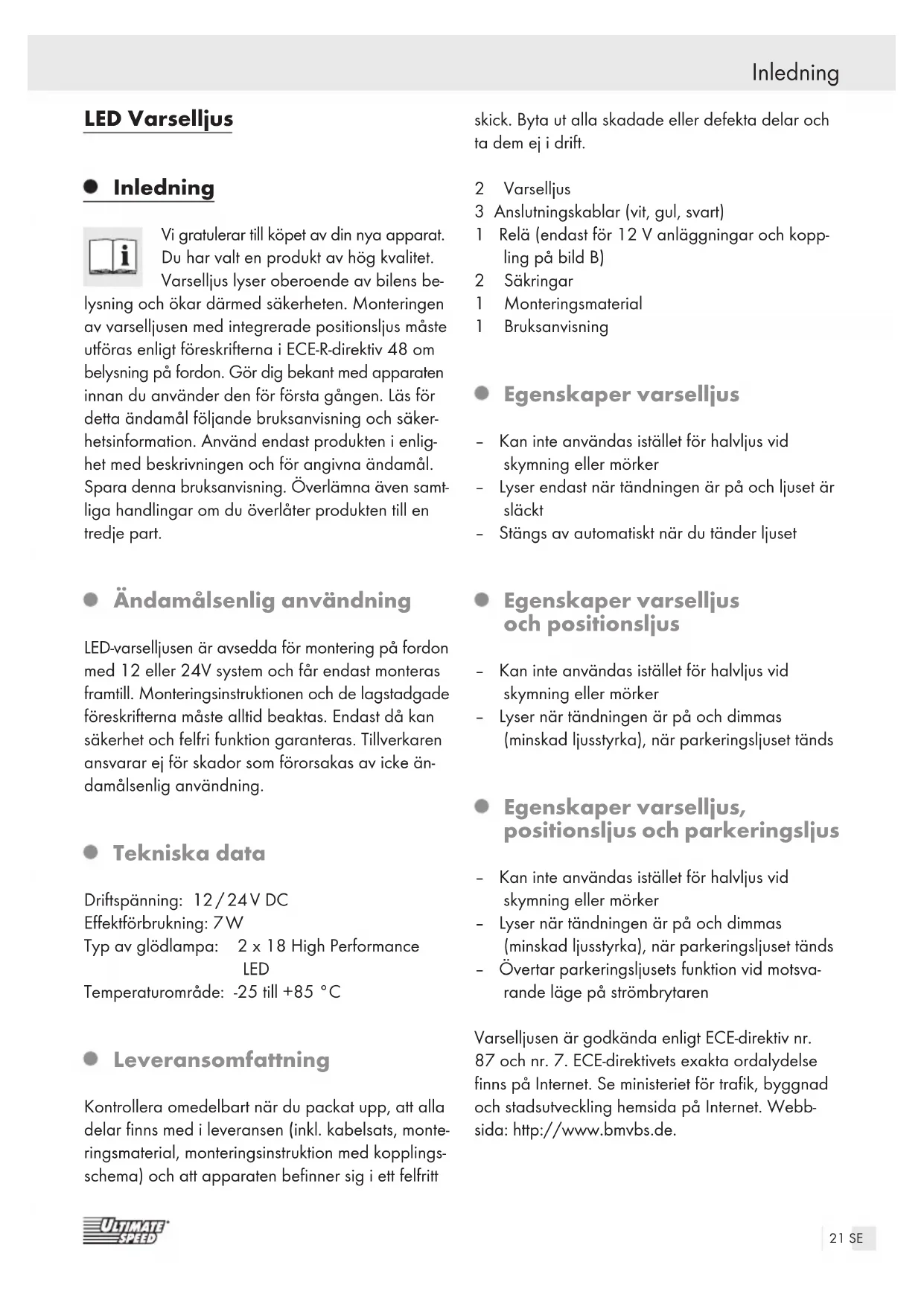 Yellow side-light White ignition/ switched plus Black negative (Figs. B, C, D) Cleaning and care Do not use solvents, petrol etc, otherwise there is a risk of damage to the product. Clean the lens of the daytime running light with a damp cloth. Disposal The packaging is made from environ- mentally friendly materials, which may be disposed through your local recycling facilities. Contact your local authorities for information on how to dispose of the product at the end of product life. To help protect the environment, please dispose the product properly, not in house- hold waste, when it has reached the end of its useful life. Information on collection points and their opening hours can be obtained from your local authority. Guarantee and service Warranty declaration This product comes with a 3 year guarantee. Please keep your receipt as proof of purchase. The product has been produced to the highest standards and thoroughly checked before dispatch. The guarantee only applies to faults in material or manufacture when used properly. The guarantee is void in cases of unauthorised tampering. Your statutory rights are not restricted in any way by this warranty. Contact the service centre by telephone if there is a guarantee case.20 GB Guarantee and service Service address System Partner Autoteile GmbH & Co. KG Benzstrasse 1 76185 Karlsruhe, Germany 0049 / (0) 721 / 625 28–866 IAN 75238 When inquiring about your product, please have your receipt and product number (e.g. IAN 12345) ready as your proof of purchase. Manufacturer System Partner Autoteile GmbH & Co. KG Benzstrasse 1 76185 Karlsruhe, Germany21 SE Inledning LED Varselljus Inledning Vi gratulerar till köpet av din nya apparat. Du har valt en produkt av hög kvalitet. Varselljus lyser oberoende av bilens be- lysning och ökar därmed säkerheten. Monteringen av varselljusen med integrerade positionsljus måste utföras enligt föreskrifterna i ECE-R-direktiv 48 om belysning på fordon. Gör dig bekant med apparaten innan du använder den för första gången. Läs för detta ändamål följande bruksanvisning och säker- hetsinformation. Använd endast produkten i enlig- het med beskrivningen och för angivna ändamål. Spara denna bruksanvisning. Överlämna även samt- liga handlingar om du överlåter produkten till en tredje part. Ändamålsenlig användning LED-varselljusen är avsedda för montering på fordon med 12 eller 24V system och får endast monteras framtill. Monteringsinstruktionen och de lagstadgade föreskrifterna måste alltid beaktas. Endast då kan säkerhet och felfri funktion garanteras. Tillverkaren ansvarar ej för skador som förorsakas av icke än- damålsenlig användning. Tekniska data Driftspänning: 12 / 24 V DC Effektförbrukning: 7 W Typ av glödlampa: 2 x 18 High Performance LED Temperaturområde: -25 till +85 °C Leveransomfattning Kontrollera omedelbart när du packat upp, att alla delar finns med i leveransen (inkl. kabelsats, monte- ringsmaterial, monteringsinstruktion med kopplings- schema) och att apparaten befinner sig i ett felfritt skick. Byta ut alla skadade eller defekta delar och ta dem ej i drift. 2 Varselljus 3 Anslutningskablar (vit, gul, svart) 1 Relä (endast för 12 V anläggningar och kopp- ling på bild B) 2 Säkringar 1 Monteringsmaterial 1 Bruksanvisning Egenskaper varselljus – Kan inte användas istället för halvljus vid skymning eller mörker – Lyser endast när tändningen är på och ljuset är släckt – Stängs av automatiskt när du tänder ljuset Egenskaper varselljus och positionsljus – Kan inte användas istället för halvljus vid skymning eller mörker – Lyser när tändningen är på och dimmas (minskad ljusstyrka), när parkeringsljuset tänds Egenskaper varselljus, positionsljus och parkeringsljus – Kan inte användas istället för halvljus vid skymning eller mörker – Lyser när tändningen är på och dimmas (minskad ljusstyrka), när parkeringsljuset tänds – Övertar parkeringsljusets funktion vid motsva- rande läge på strömbrytaren Varselljusen är godkända enligt ECE-direktiv nr. 87 och nr. 7. ECE-direktivets exakta ordalydelse finns på Internet. Se ministeriet för trafik, byggnad och stadsutveckling hemsida på Internet. Webb- sida: http://www.bmvbs.de.22 SE Allmän säkerhetsinformation / Monteringsanvisningar och varningar / Montering … Allmän säkerhetsinformation Ett icke beaktande av följande hänvisningar kan förorsaka personskador eller materiella skador (elektriska stötar, brand, allvarliga skador). Förvara denna säkerhetsinformation väl.