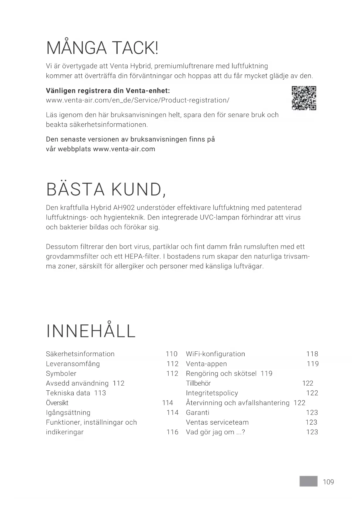 Opdatér eventuelt din smartphones eller tablets operativsystem.109SE MÅNGA TACK! Vi är övertygade att Venta Hybrid, premiumluftrenare med luftfuktning kommer att överträffa din förväntningar och hoppas att du får mycket glädje av den. Vänligen registrera din Venta-enhet: www.venta-air.com/en_de/Service/Product-registration/ Läs igenom den här bruksanvisningen helt, spara den för senare bruk och beakta säkerhetsinformationen. Den senaste versionen av bruksanvisningen finns på vår webbplats www.venta-air.com BÄSTA KUND, Den kraftfulla Hybrid AH902 understöder effektivare luftfuktning med patenterad luftfuktnings- och hygienteknik. Den integrerade UVC-lampan förhindrar att virus och bakterier bildas och förökar sig. Dessutom filtrerar den bort virus, partiklar och fint damm från rumsluften med ett grovdammsfilter och ett HEPA-filter. I bostadens rum skapar den naturliga trivsam- ma zoner, särskilt för allergiker och personer med känsliga luftvägar. INNEHÅLL Säkerhetsinformation 110 Leveransomfång 112 Symboler 112 Avsedd användning 112 Tekniska data 113 Översikt 114 Igångsättning 114 Funktioner, inställningar och indikeringar 116 WiFi-konfiguration 118 Venta-appen 119 Rengöring och skötsel 119 Tillbehör 122 Integritetspolicy 122 Återvinning och avfallshantering 122 Garanti 123 Ventas serviceteam 123 Vad gör jag om ...? 123110 SE