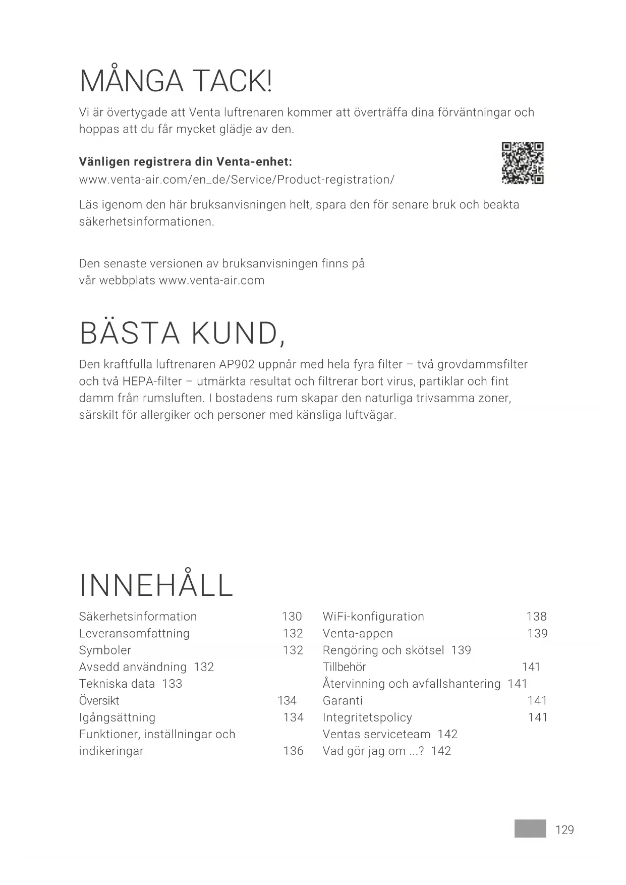 Oppdater eventuelt operativsystemet til smarttelefonen eller nettbrettet ditt.129SV MÅNGA TACK! Vi är övertygade att Venta luftrenaren kommer att överträffa dina förväntningar och hoppas att du får mycket glädje av den. Vänligen registrera din Venta-enhet: www.venta-air.com/en_de/Service/Product-registration/ Läs igenom den här bruksanvisningen helt, spara den för senare bruk och beakta säkerhetsinformationen. Den senaste versionen av bruksanvisningen finns på vår webbplats www.venta-air.com BÄSTA KUND, Den kraftfulla luftrenaren AP902 uppnår med hela fyra filter – två grovdammsfilter och två HEPA-filter – utmärkta resultat och filtrerar bort virus, partiklar och fint damm från rumsluften. I bostadens rum skapar den naturliga trivsamma zoner, särskilt för allergiker och personer med känsliga luftvägar. INNEHÅLL Säkerhetsinformation 130 Leveransomfattning 132 Symboler 132 Avsedd användning 132 Tekniska data 133 Översikt 134 Igångsättning 134 Funktioner, inställningar och indikeringar 136 WiFi-konfiguration 138 Venta-appen 139 Rengöring och skötsel 139 Tillbehör 141 Återvinning och avfallshantering 141 Garanti 141 Integritetspolicy 141 Ventas serviceteam 142 Vad gör jag om ...? 142130 SV