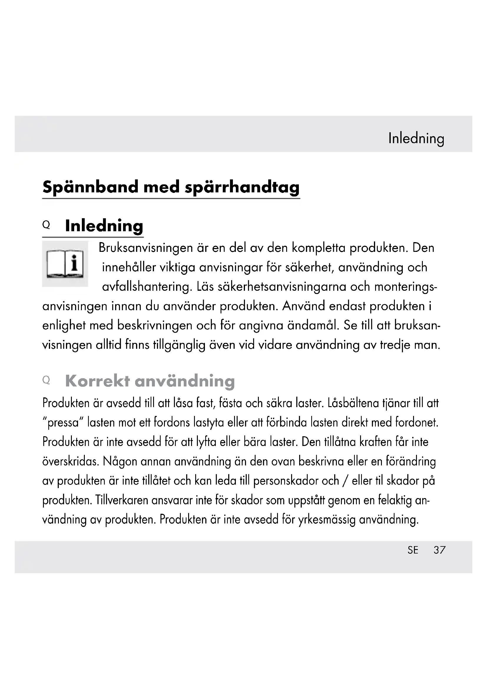 Korrekt användning Produkten är avsedd till att låsa fast, fästa och säkra laster. Låsbältena tjänar till att “pressa“ lasten mot ett fordons lastyta eller att förbinda lasten direkt med fordonet. Produkten är inte avsedd för att lyfta eller bära laster. Den tillåtna kraften får inte överskridas. Någon annan användning än den ovan beskrivna eller en förändring av produkten är inte tillåtet och kan leda till personskador och / eller til skador på produkten. Tillverkaren ansvarar inte för skador som uppstått genom en felaktig an- vändning av produkten. Produkten är inte avsedd för yrkesmässig användning.38 SE