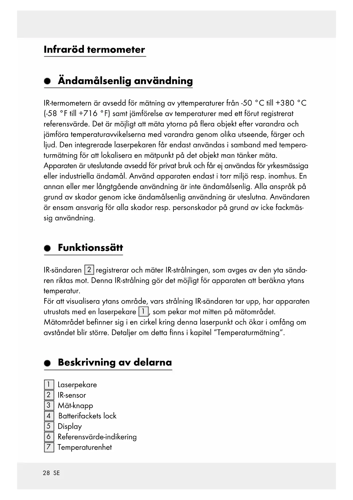 registrerar och mäter IR-strålningen, som avges av den yta sända- ren riktas mot. Denna IR-strålning gör det möjligt för apparaten att beräkna ytans temperatur. För att visualisera ytans område, vars strålning IR-sändaren tar upp, har apparaten utrustats med en laserpekare