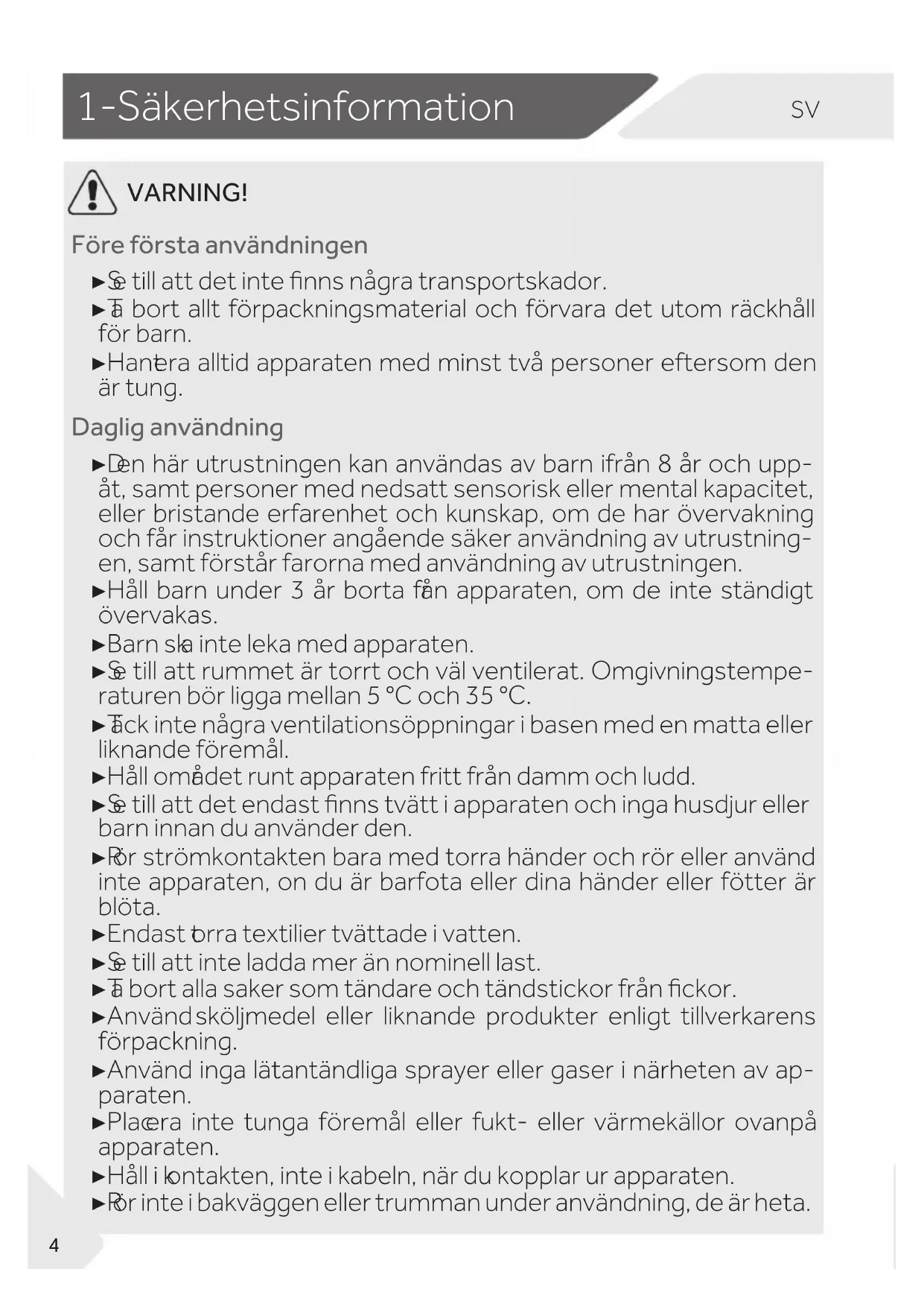 VARNING! Före första användningen ▶ S e till att det inte nns några transportskador. ▶ T a bort allt förpackningsmaterial och förvara det utom räckhåll för barn. ▶ Hant era alltid apparaten med minst två personer eftersom den är tung. Daglig användning ▶ D en här utrustningen kan användas av barn ifrån 8 år och upp- åt, samt personer med nedsatt sensorisk eller mental kapacitet, eller bristande erfarenhet och kunskap, om de har övervakning och får instruktioner angående säker användning av utrustning- en, samt förstår farorna med användning av utrustningen. ▶ Håll barn under 3 år borta fr ån apparaten, om de inte ständigt övervakas. ▶ Barn sk a inte leka med apparaten. ▶ S e till att rummet är torrt och väl ventilerat. Omgivningstempe- raturen bör ligga mellan 5 °C och 35 °C. ▶ T äck inte några ventilationsöppningar i basen med en matta eller liknande föremål. ▶ Håll omr ådet runt apparaten fritt från damm och ludd. ▶ S e till att det endast nns tvätt i apparaten och inga husdjur eller barn innan du använder den. ▶ R ör strömkontakten bara med torra händer och rör eller använd inte apparaten, on du är barfota eller dina händer eller fötter är blöta. ▶ Endast t orra textilier tvättade i vatten. ▶ S e till att inte ladda mer än nominell last. ▶ T a bort alla saker som tändare och tändstickor från ckor. ▶ Använd sköljmedel eller liknande produkter enligt tillverkarens förpackning. ▶ Använd inga lät tantändliga sprayer eller gaser i närheten av ap- paraten. ▶ Plac era inte tunga föremål eller fukt- eller värmekällor ovanpå apparaten. ▶ Håll i k ontakten, inte i kabeln, när du kopplar ur apparaten. ▶ R ör inte i bakväggen eller trumman under användning, de är heta.SV