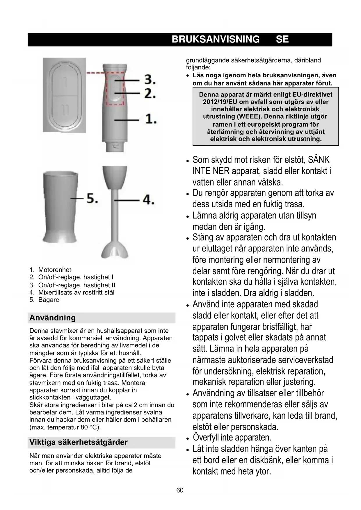 - Låt inte sladden hänga över kanten på ett bord eller en diskbänk, eller komma i kontakt med heta ytor. Denna apparat är märkt enligt EU-direktivet 2012/19/EU om avfall som utgörs av eller innehåller elektrisk och elektronisk utrustning (WEEE). Denna riktlinje utgör ramen i ett europeiskt program för återlämning och återvinning av uttjänt elektrisk och elektronisk utrustning.61