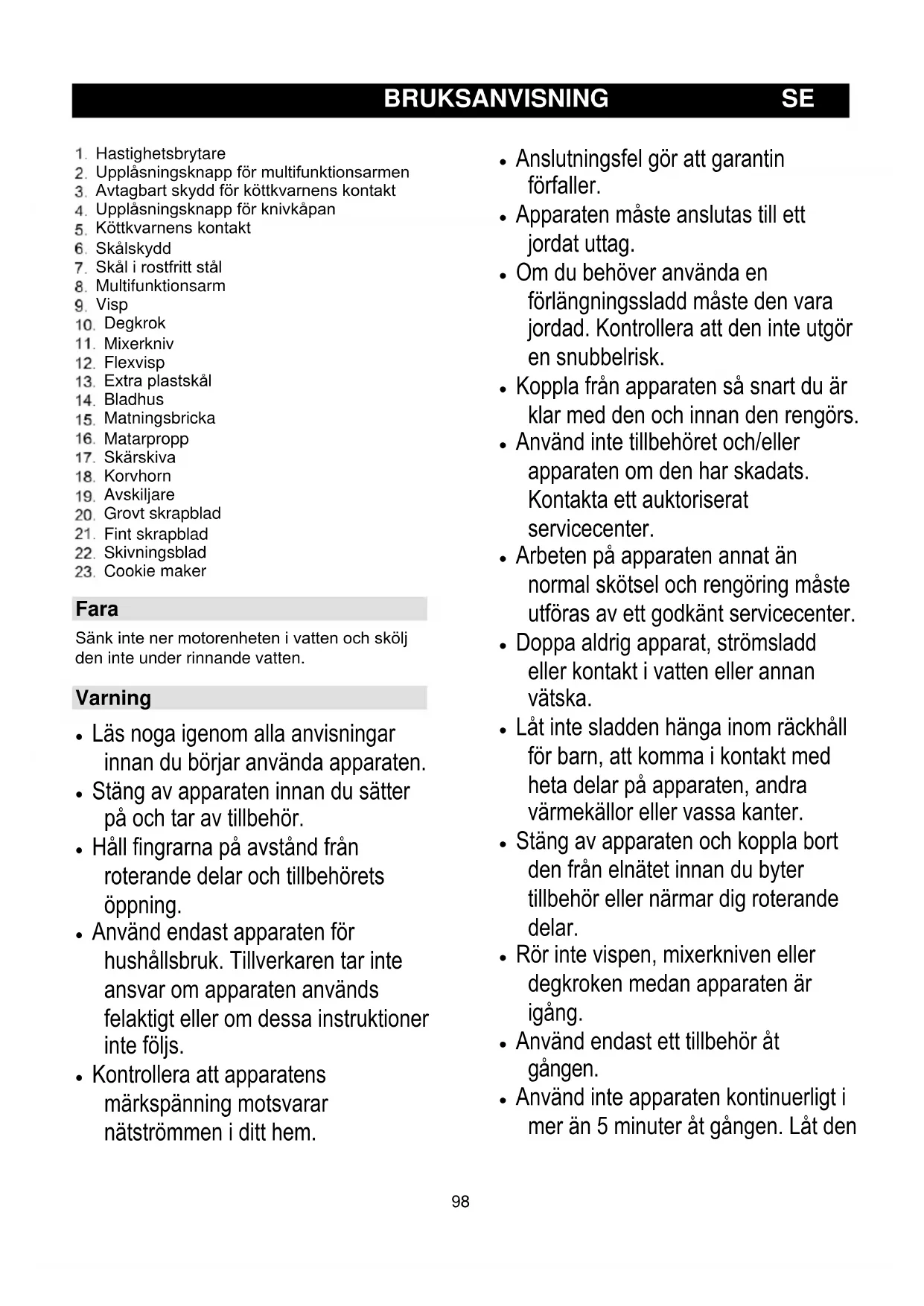 NYE APPARATET Vi forbeholder oss retten til å foreta endringer!98 BRUKSANVISNING SE Hastighetsbrytare Upplåsningsknapp för multifunktionsarmen Avtagbart skydd för köttkvarnens kontakt Upplåsningsknapp för knivkåpan Köttkvarnens kontakt Skålskydd Skål i rostfritt stål Multifunktionsarm Visp Degkrok Mixerkniv Flexvisp Extra plastskål Bladhus Matningsbricka Matarpropp Skärskiva Korvhorn Avskiljare Grovt skrapblad Fint skrapblad Skivningsblad Cookie maker Fara Sänk inte ner motorenheten i vatten och skölj den inte under rinnande vatten. Varning
