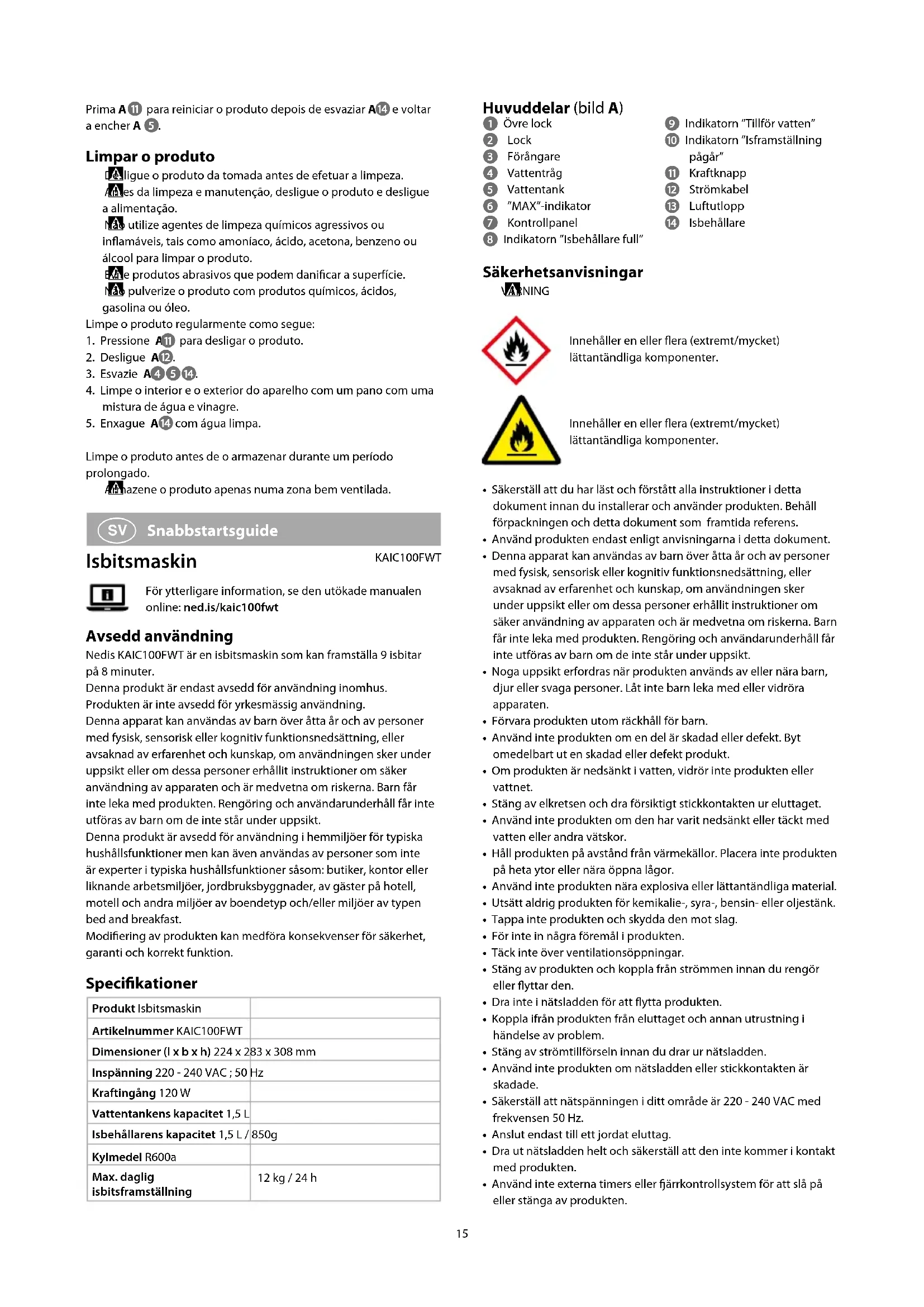 Snabbstartsguide Isbitsmaskin KAIC100FWTFör ytterligare information, se den utökade manualen online: ned.is/kaic100fwt Avsedd användning Nedis KAIC100FWT är en isbitsmaskin som kan framställa 9 isbitar på 8 minuter.Denna produkt är endast avsedd för användning inomhus.Produkten är inte avsedd för yrkesmässig användning.Denna apparat kan användas av barn över åtta år och av personer med fysisk, sensorisk eller kognitiv funktionsnedsättning, eller avsaknad av erfarenhet och kunskap, om användningen sker under uppsikt eller om dessa personer erhållit instruktioner om säker användning av apparaten och är medvetna om riskerna. Barn får inte leka med produkten. Rengöring och användarunderhåll får inte utföras av barn om de inte står under uppsikt.Denna produkt är avsedd för användning i hemmiljöer för typiska hushållsfunktioner men kan även användas av personer som inte är experter i typiska hushållsfunktioner såsom: butiker, kontor eller liknande arbetsmiljöer, jordbruksbyggnader, av gäster på hotell, motell och andra miljöer av boendetyp och/eller miljöer av typen bed and breakfast.Modiering av produkten kan medföra konsekvenser för säkerhet, garanti och korrekt funktion. Specikationer Produkt IsbitsmaskinArtikelnummer KAIC100FWTDimensioner (l x b x h) 224 x 283 x 308 mmInspänning 220 - 240 VAC ; 50 HzKraftingång 120 WVattentankens kapacitet 1,5 LIsbehållarens kapacitet 1,5 L / 850gKylmedel R600aMax. daglig isbitsframställning12 kg / 24 h16 Att rengöra produkten