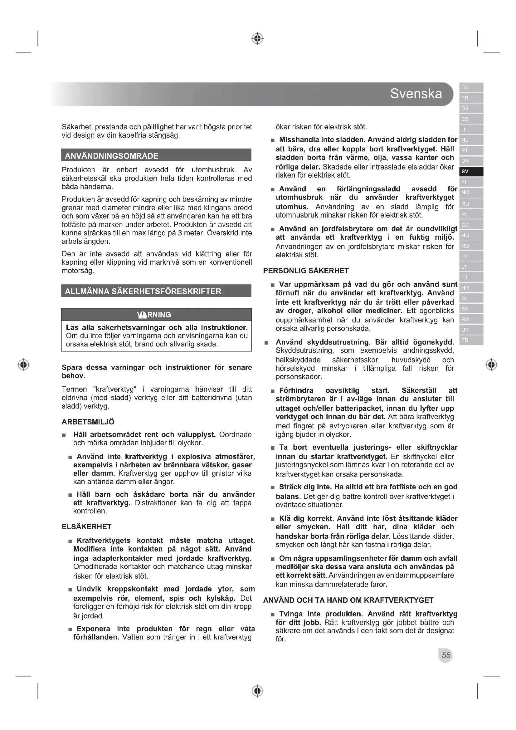 BATTERIER VARNING För att undvika den fara för brand, personskador eller produktskador som orsakas av en kortslutning, doppa inte ner verktyget, utbytesbatteriet eller laddaren i vätskor och se till att ingen vätska kan tränga in i apparaterna eller batterierna. Korroderande eller ledande vätskor, som saltvatten, vissa kemikalier, blekningsmedel eller produkter som innehåller blekmedel, kan orsaka en kortslutning. ANVÄNDNING ■ Studera skick på träd och grenar före arbetet påbörjas. Om det finns tecken på skador, ruttnande eller håligheter ska du inte beskära själv. Skadade eller ruttna grenar är mycket instabila. Be om hjälp av erfaren trädkunning person. ■ Stå aldrig under grenen som ska beskäras. ■ Beskäras grenar inte alltid faller rent till marken. De fångas enkelt upp och avvisas. Se till att säkerhetsavståndet är minst dubbla längden på den gren som skärs av och att det bibehålls under hela arbetet. Om det inte går ska du be om hjälp av erfaren trädkunning person. ■ Se till att fallande grenar inte skadar dig själv, åskådare eller egendom inklusive elkablar. ■ Använd aldrig verktyget med staven i större vinkel än 60° från horisontellt läge. ■ Använd aldrig beskäraren med skärbladen närmare överhängande elkablar än 10 meter. ■ Tvinga inte produkten, låt kedjan göra jobbet i sin egen takt. ■ Försök inte att skära grenen för nära trädstammen. Lämna ca 15 cm från stammen till skäret. ■ Vila sågklingan mot grenen som ska beskäras och tryck försiktigt sågen framåt så att stötdämparen också kommer i kontakt med grenen. Det bättrar på stabiliteten, kapningen och ger renare skär. ■ Mindre grenar som har liten diameter och inte är tunga kan skäras i ett skär längst ned på sågklingan. ■ Grenar med större diameter och som är tyngre kan brytas eller splittras under sågning. Användaren måste först göra ett snitt under grenen med ovandelen på sågklingan. Snittet ska vara cirka en tredjedel genom grenen. ■ Överväg att beskära stora grenar i hanterbara delar i stället för som helhet. ■ Försök aldrig börja om med sågklingan i ett gammalt skär. Börja alltid med nytt skär. Detta minskar risken för kickback och potentiell personskada.