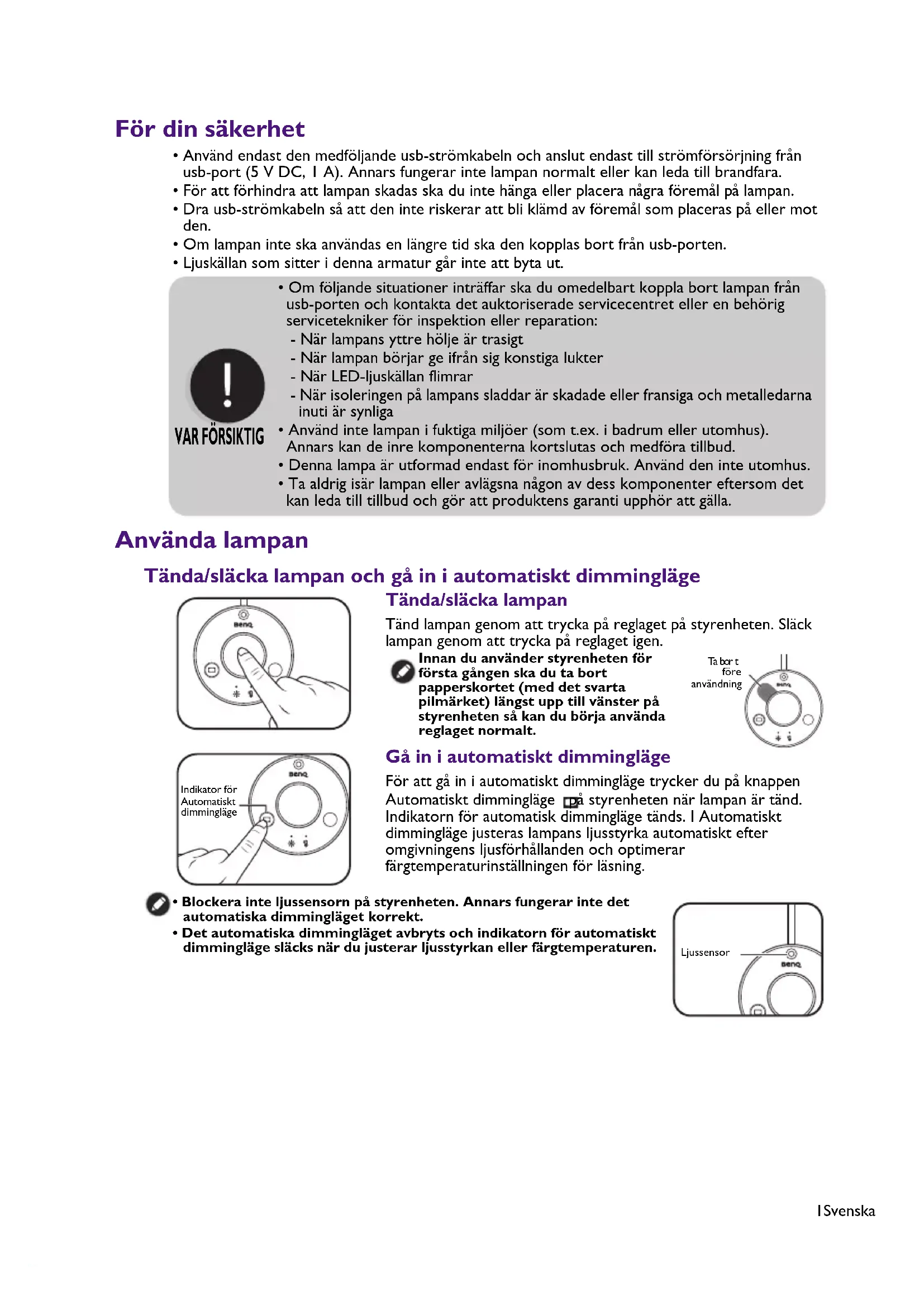 Tända/släcka lampan Tänd lampan genom att trycka på reglaget på styrenheten. Släck lampan genom att trycka på reglaget igen. Innan du använder styrenheten för första gången ska du ta bort papperskortet (med det svarta pilmärket) längst upp till vänster på styrenheten så kan du börja använda reglaget normalt. Gå in i automatiskt dimmingläge För att gå in i automatiskt dimmingläge trycker du på knappen Automatiskt dimmingläge på styrenheten när lampan är tänd. Indikatorn för automatisk dimmingläge tänds. I Automatiskt dimmingläge justeras lampans ljusstyrka automatiskt efter omgivningens ljusförhållanden och optimerar färgtemperaturinställningen för läsning. Ta bor t före användning Indikator för Automatiskt dimmingläge Ljussensor2Svenska Justera ljusstyrka och färgtemperatur Underhåll och felsökning