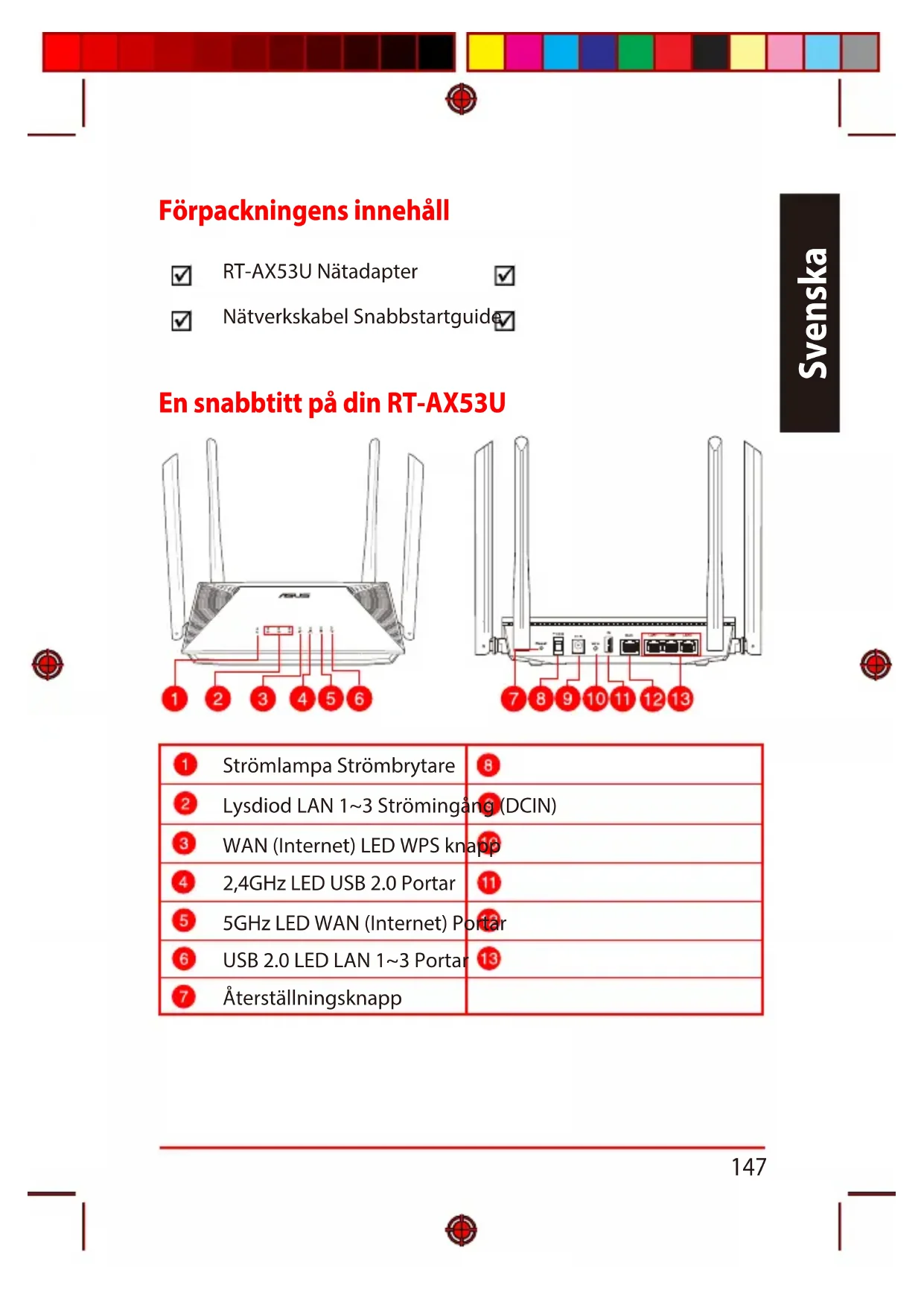 Svenska En snabbtitt på din RT-AX53U En snabbtitt på din RT-AX53U Förpackningens innehåll Förpackningens innehåll RT-AX53U Nätadapter Nätverkskabel Snabbstartguide Strömlampa Strömbrytare Lysdiod LAN 1~3 Strömingång (DCIN) WAN (Internet) LED WPS knapp 2,4GHz LED USB 2.0 Portar 5GHz LED WAN (Internet) Portar USB 2.0 LED LAN 1~3 Portar Återställningsknapp Svenska