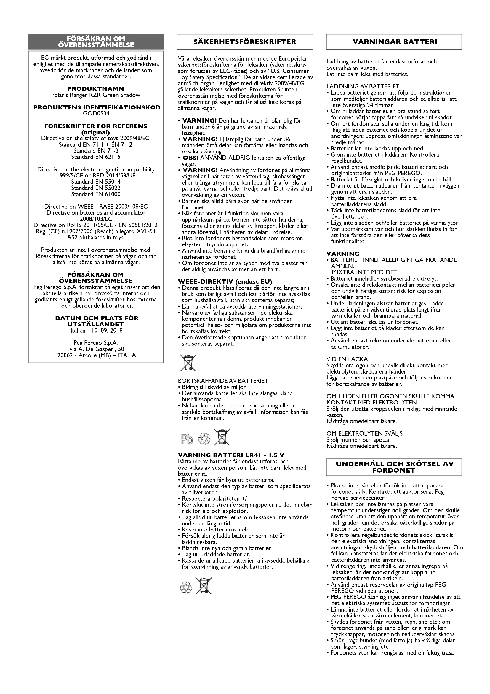 ÖVERENSSTÄMMELSE Peg Perego S.p.A. försäkrar på eget ansvar att den aktuella artikeln har provkörts internt och godkänts enligt gällande föreskrifter hos externa och oberoende laboratorier.