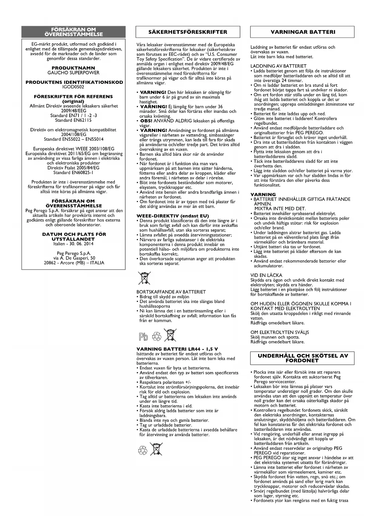 ÖVERENSSTÄMMELSE Peg Perego S.p.A. försäkrar på eget ansvar att den aktuella artikeln har provkörts internt och godkänts enligt gällande föreskrifter hos externa och oberoende laboratorier.