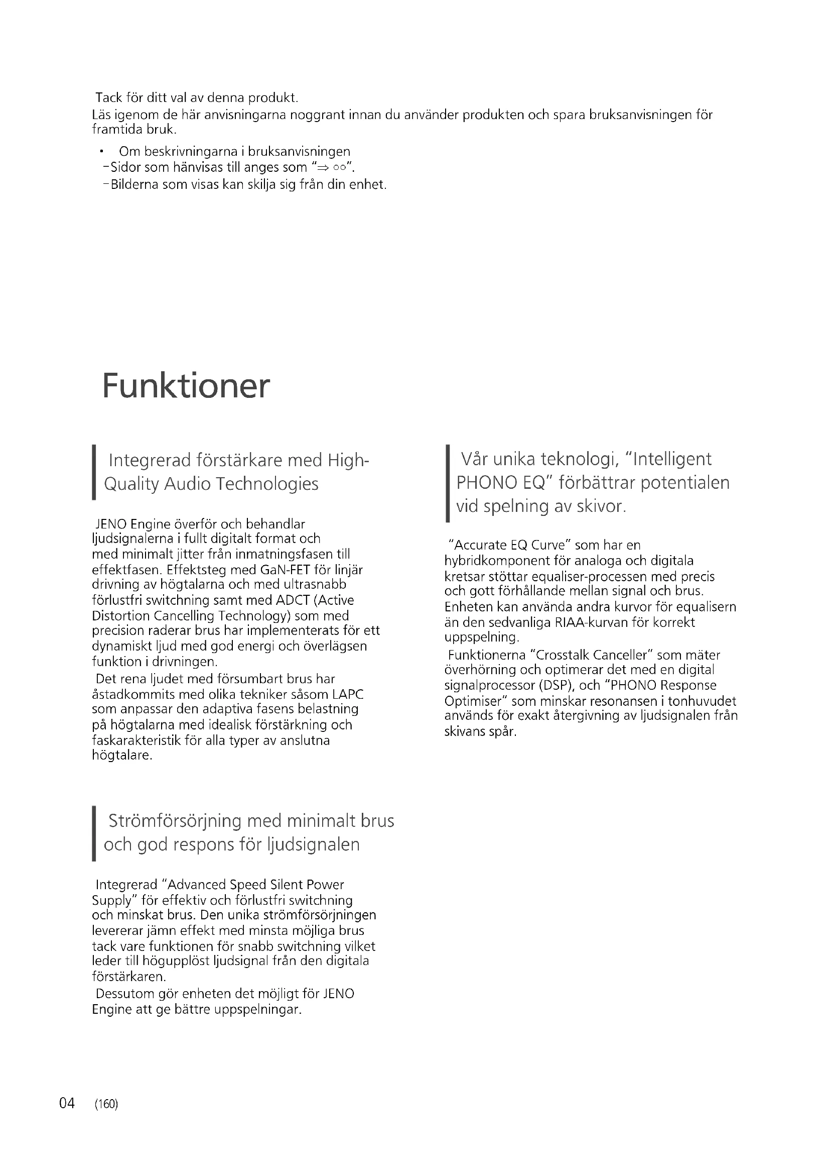 - Om beskrivningarna i bruksanvisningen - Sidor som hänvisas till anges som “ ○○”. - Bilderna som visas kan skilja sig från din enhet. Integrerad förstärkare med High- Quality Audio Technologies JENO Engine överför och behandlar ljudsignalerna i fullt digitalt format och med minimalt jitter från inmatningsfasen till effektfasen. Effektsteg med GaN-FET för linjär drivning av högtalarna och med ultrasnabb förlustfri switchning samt med ADCT (Active Distortion Cancelling Technology) som med precision raderar brus har implementerats för ett dynamiskt ljud med god energi och överlägsen funktion i drivningen. Det rena ljudet med försumbart brus har åstadkommits med olika tekniker såsom LAPC som anpassar den adaptiva fasens belastning på högtalarna med idealisk förstärkning och faskarakteristik för alla typer av anslutna högtalare. Strömförsörjning med minimalt brus och god respons för ljudsignalen Integrerad “Advanced Speed Silent Power Supply” för effektiv och förlustfri switchning och minskat brus. Den unika strömförsörjningen levererar jämn effekt med minsta möjliga brus tack vare funktionen för snabb switchning vilket leder till högupplöst ljudsignal från den digitala förstärkaren. Dessutom gör enheten det möjligt för JENO Engine att ge bättre uppspelningar. Vår unika teknologi, “Intelligent PHONO EQ” förbättrar potentialen vid spelning av skivor. “Accurate EQ Curve” som har en hybridkomponent för analoga och digitala kretsar stöttar equaliser-processen med precis och gott förhållande mellan signal och brus. Enheten kan använda andra kurvor för equalisern än den sedvanliga RIAA-kurvan för korrekt uppspelning. Funktionerna “Crosstalk Canceller” som mäter överhörning och optimerar det med en digital signalprocessor (DSP), och “PHONO Response Optimiser” som minskar resonansen i tonhuvudet används för exakt återgivning av ljudsignalen från skivans spår. FunktionerSvenska