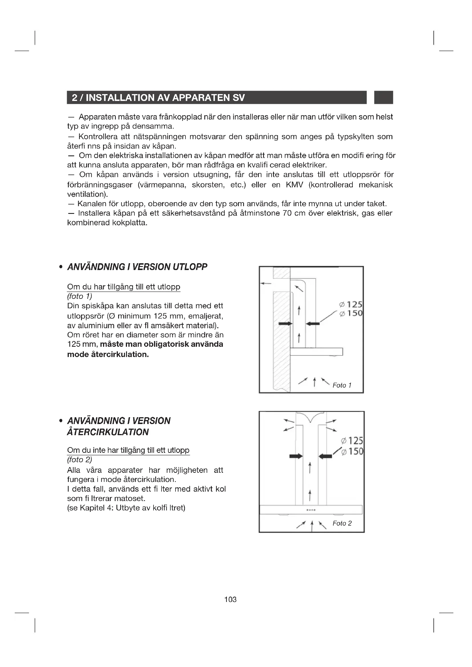 - ANVÄNDNING I VERSION ÅTERCIRKULATION Om du har tillgång till ett utlopp (foto 1) Din spiskåpa kan anslutas till detta med ett utloppsrör (Ø minimum 125 mm, emaljerat, av aluminium eller av amsäkert material). Om röret har en diameter som är mindre än 125 mm, måste man obligatorisk använda mode återcirkulation. Om du inte har tillgång till ett utlopp (foto 2) Alla våra apparater har möjligheten att fungera i mode återcirkulation. I detta fall, används ett lter med aktivt kol som ltrerar matoset. (se Kapitel 4: Utbyte av kol ltret) — Apparaten måste vara frånkopplad när den installeras eller när man utför vilken som helst typ av ingrepp på densamma. — Kontrollera att nätspänningen motsvarar den spänning som anges på typskylten som åter nns på insidan av kåpan. — Om den elektriska installationen av kåpan medför att man måste utföra en modi ering för att kunna ansluta apparaten, bör man rådfråga en kvali cerad elektriker. — Om kåpan används i version utsugning, får den inte anslutas till ett utloppsrör för förbränningsgaser (värmepanna, skorsten, etc.) eller en KMV (kontrollerad mekanisk ventilation). — Kanalen för utlopp, oberoende av den typ som används, får inte mynna ut under taket. — Installera kåpan på ett säkerhetsavstånd på åtminstone 70 cm över elektrisk, gas eller kombinerad kokplatta. Foto 1 Foto 2104